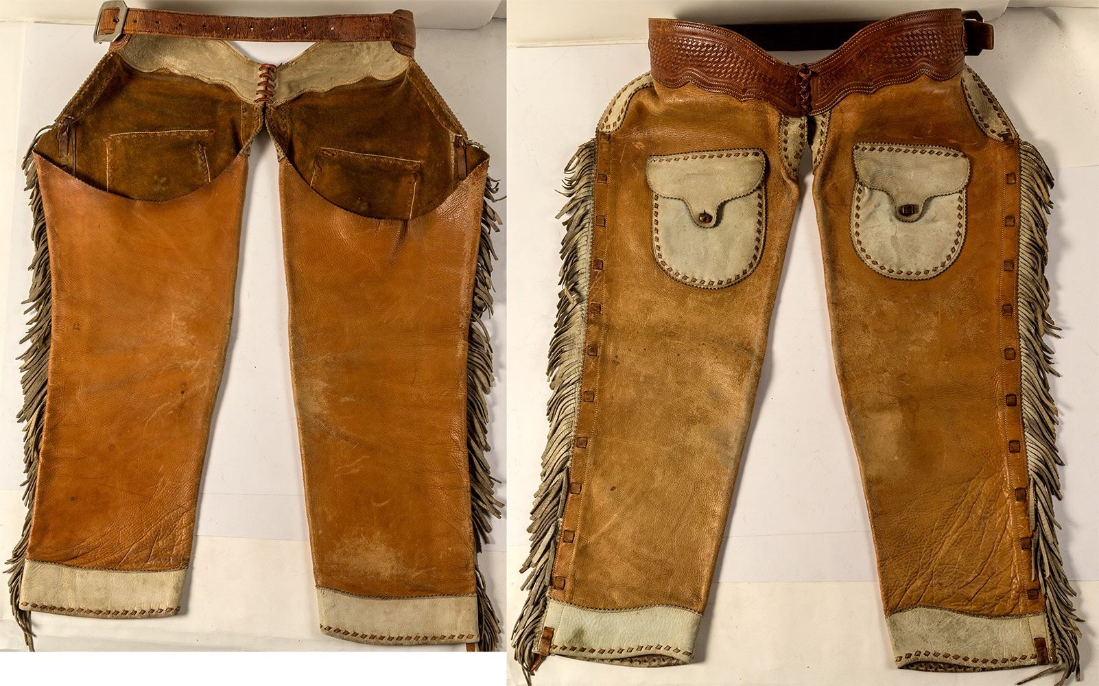 No maker on chaps. Light and medium colored leather with light gray pockets, fringes and accents. Consigned by The Cowboy Connection in Livingston, MT. State: City: Date: ID# 49871