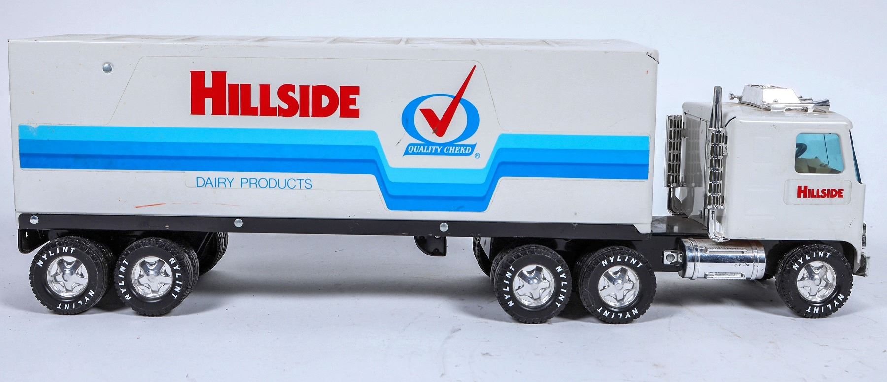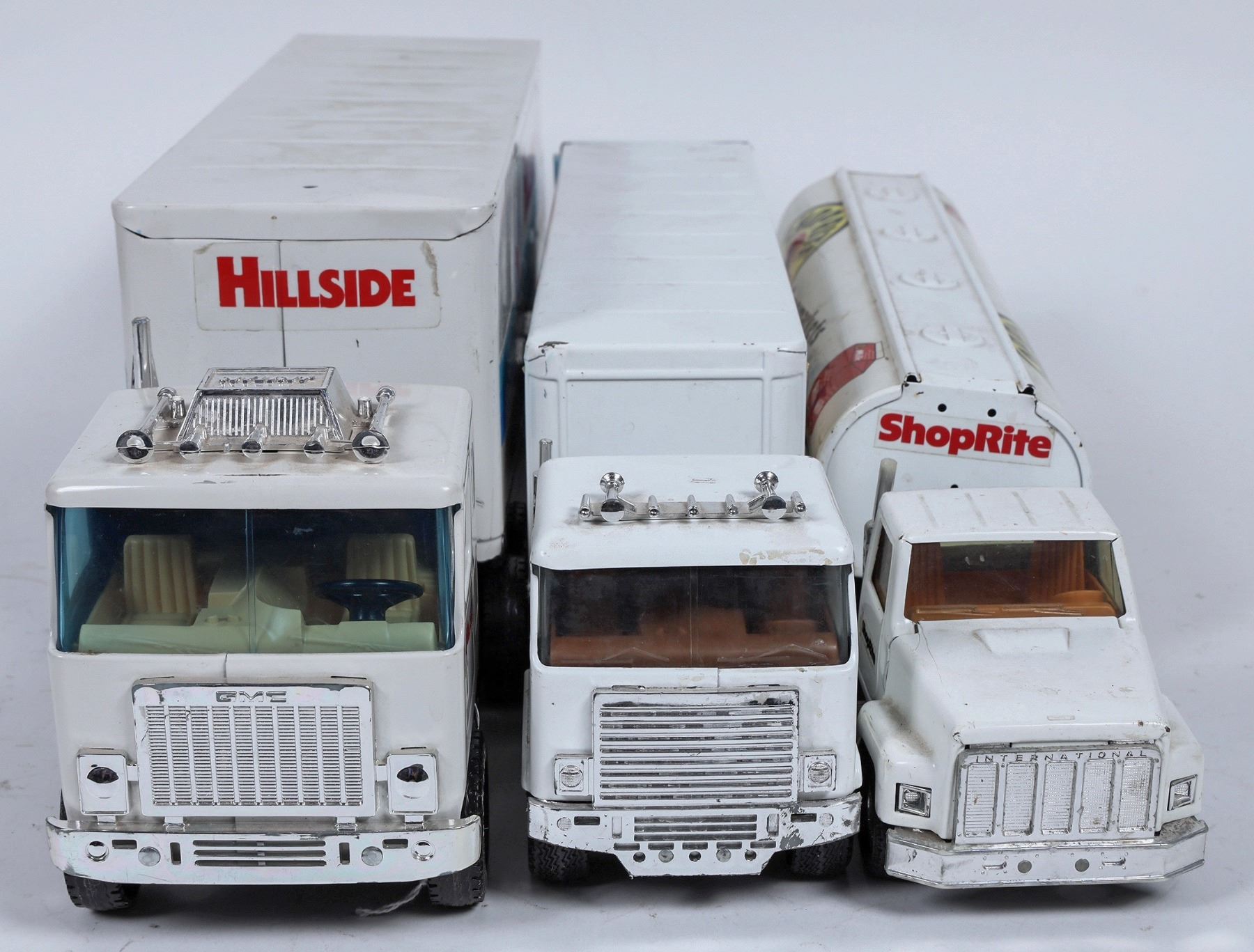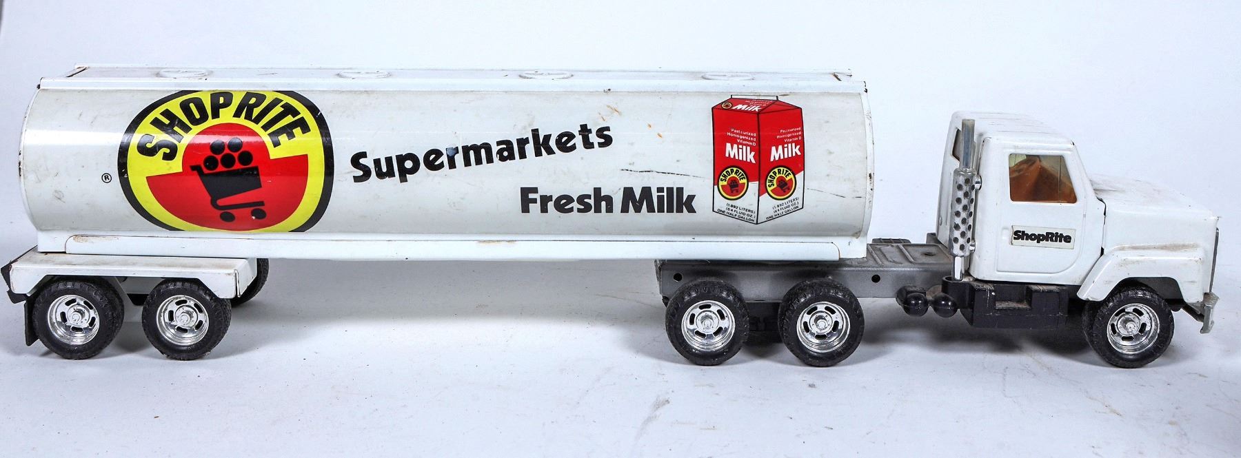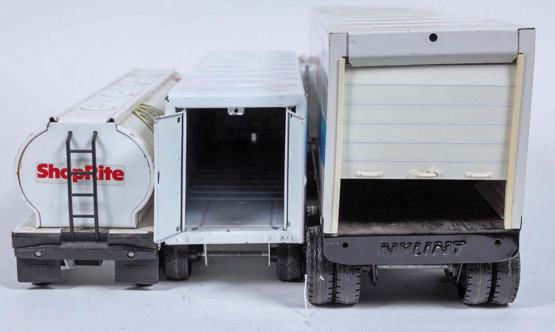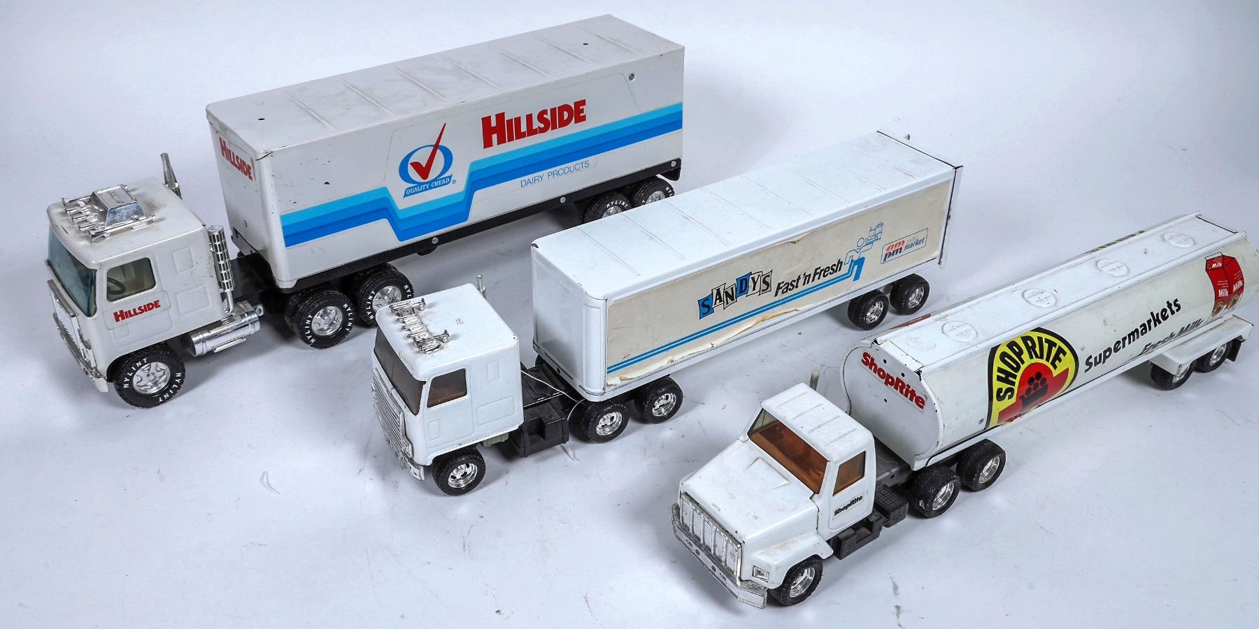 Lot of 3. 1. Nylint Hillside Dairy Products Tractor/Box trailer,, 21" , decals very good. 2. ERTL ShopRite Rite milk tractor/tanker,19", markings in exc. cond. 3. Core mark, Am/PM tractor/box trailer, 17" L, markings exc. All three are excellent cond and complete