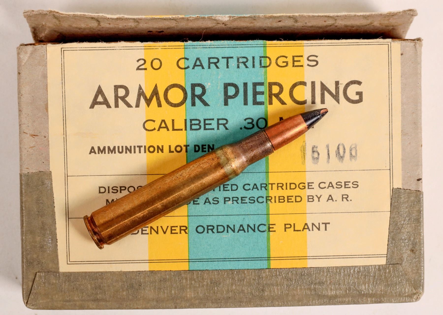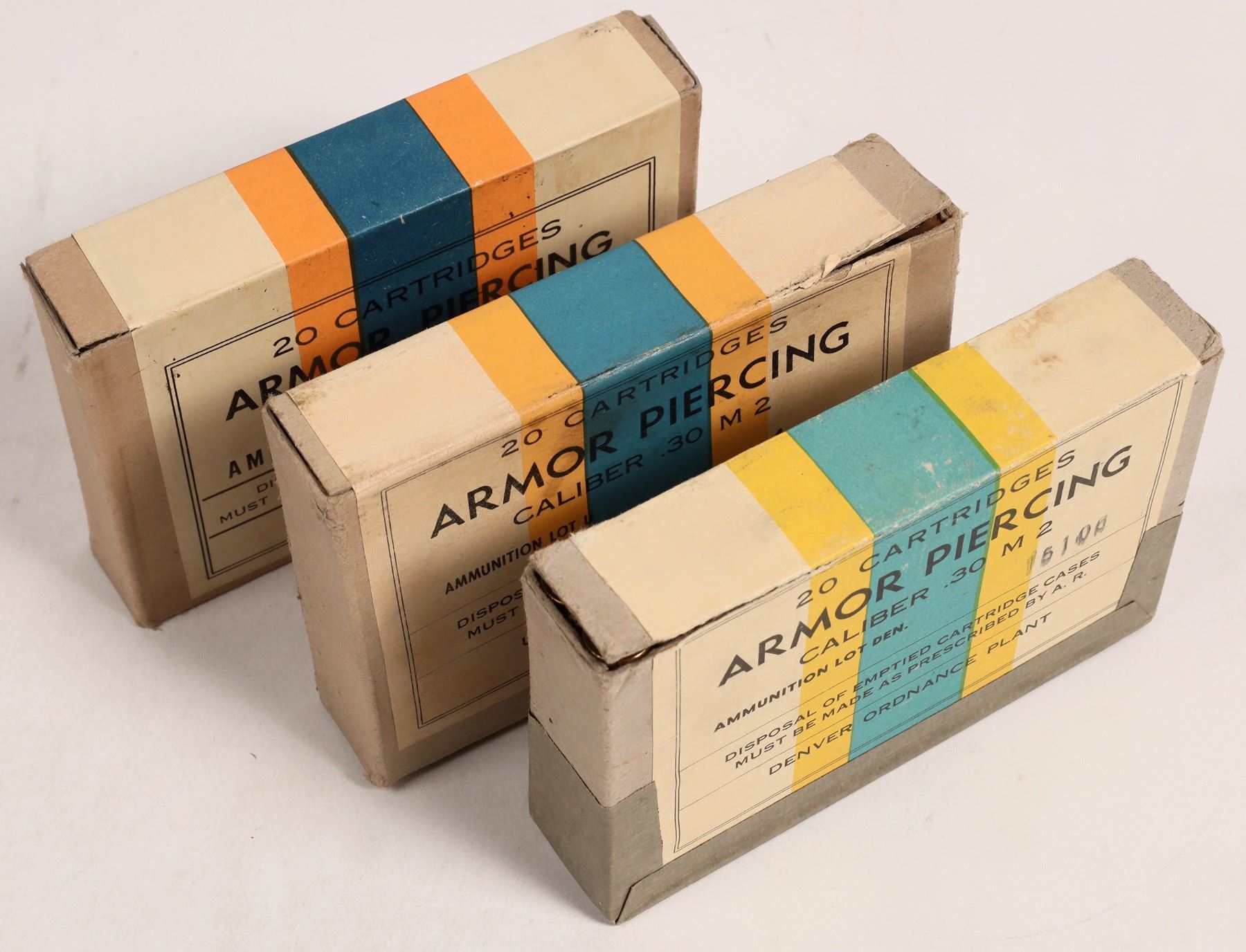 This lot contains three boxes of vintage .30 caliber M2 ammunition with the familiar green-yellow striped box. This ammunition is armor piercing and sold for collectability purposes only. The first box is marked "20 cartridges/ ARMOR PIERCING/ CALIBER .30 M2/ ammunition lot DEN. 15106/ Denver Ordnance Plant". The box has been opened but all rounds are present with sealed primers and black tips. The second box is unopened and marked "20 cartridges/ ARMOR PIERCING/ CALIBER .30 M2/ ammunition lot T.W. 18233/ Twin Cities Ordnance Plant". The third box is unopened and marked "20 cartridges/ ARMOR PIERCING/ CALIBER .30 M2/ ammunition lot U 16168/ Utah Ordnance Plant". Three different ordnance plants are represented. No sales to New York, New Jersey, California, or Hawaii. No international sales. Additional shipping charges apply. Please see photos for details.