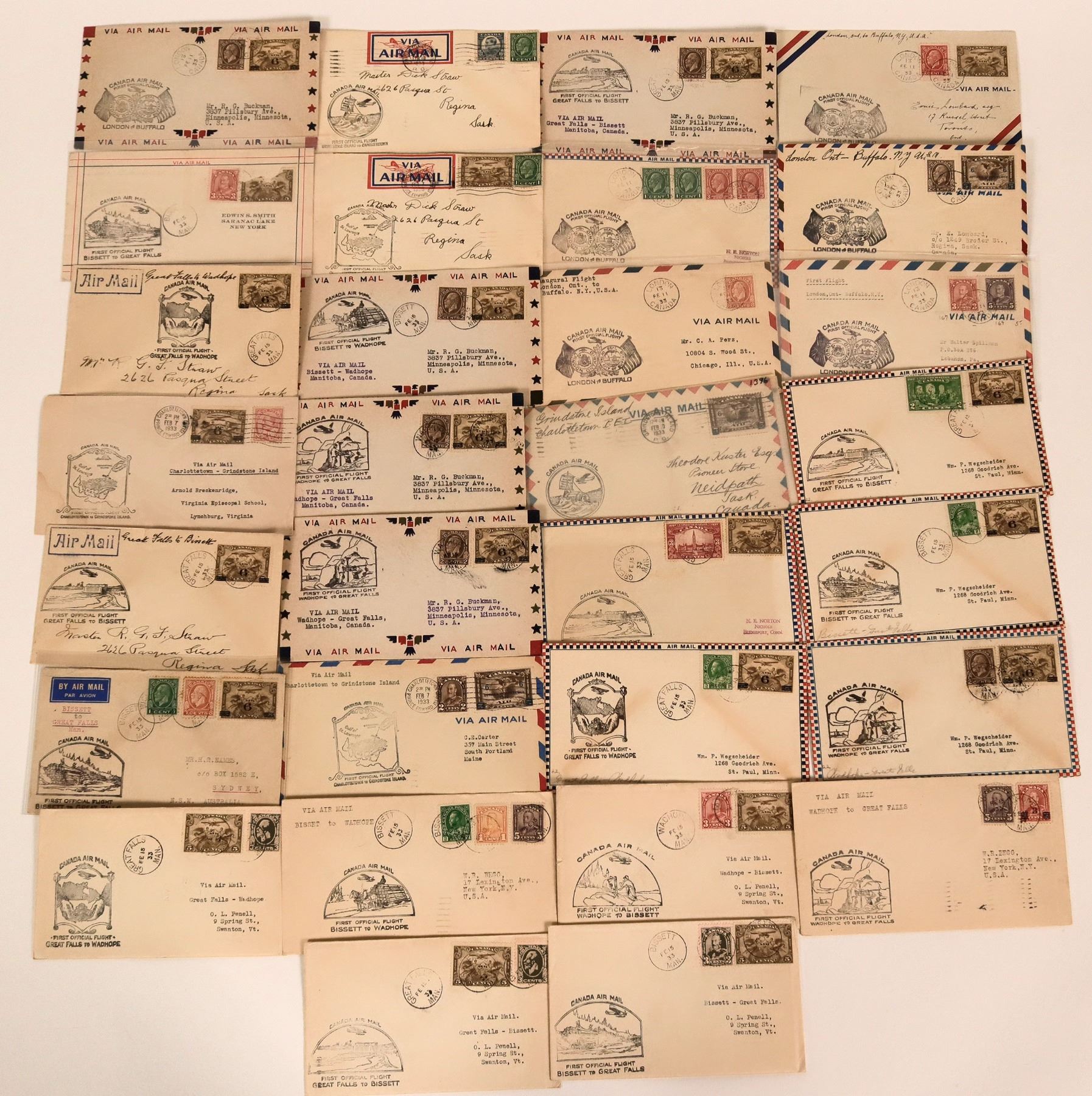 Lot of 30 Canada Air Mail first official flight covers canceled in February 1933. New routes were between Great Falls and Bissett, Wadhope and Great Falls, Wadhope and Bissett, Charlottetown and Grindstone Island, and London to Buffalo.