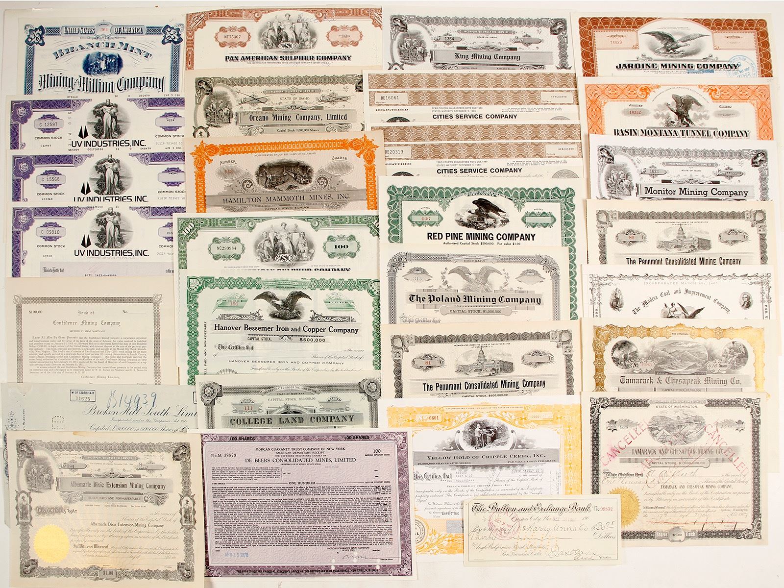 Thirty mining stock certificates, some issued some not. Many different companies. Date: Location: HWAC# 63646
