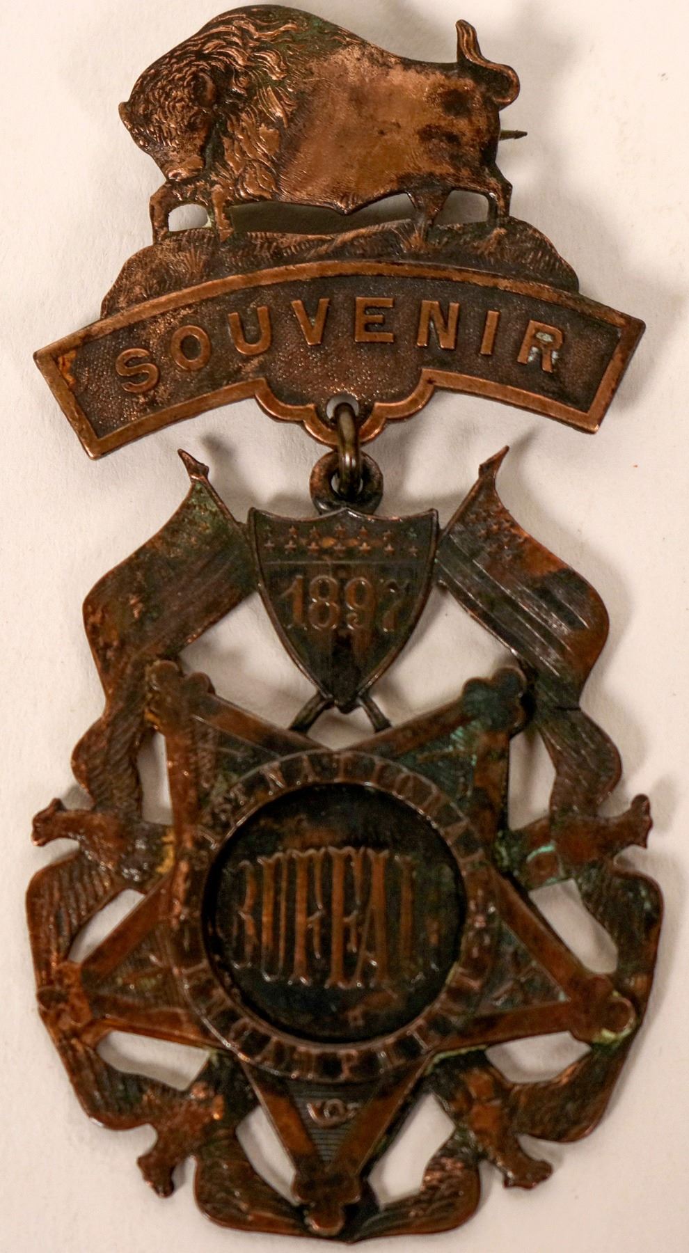 Five star badge with eagles and American flags. Buffalo adorns the top. No ribbon. Overall nice. See photo for condition.