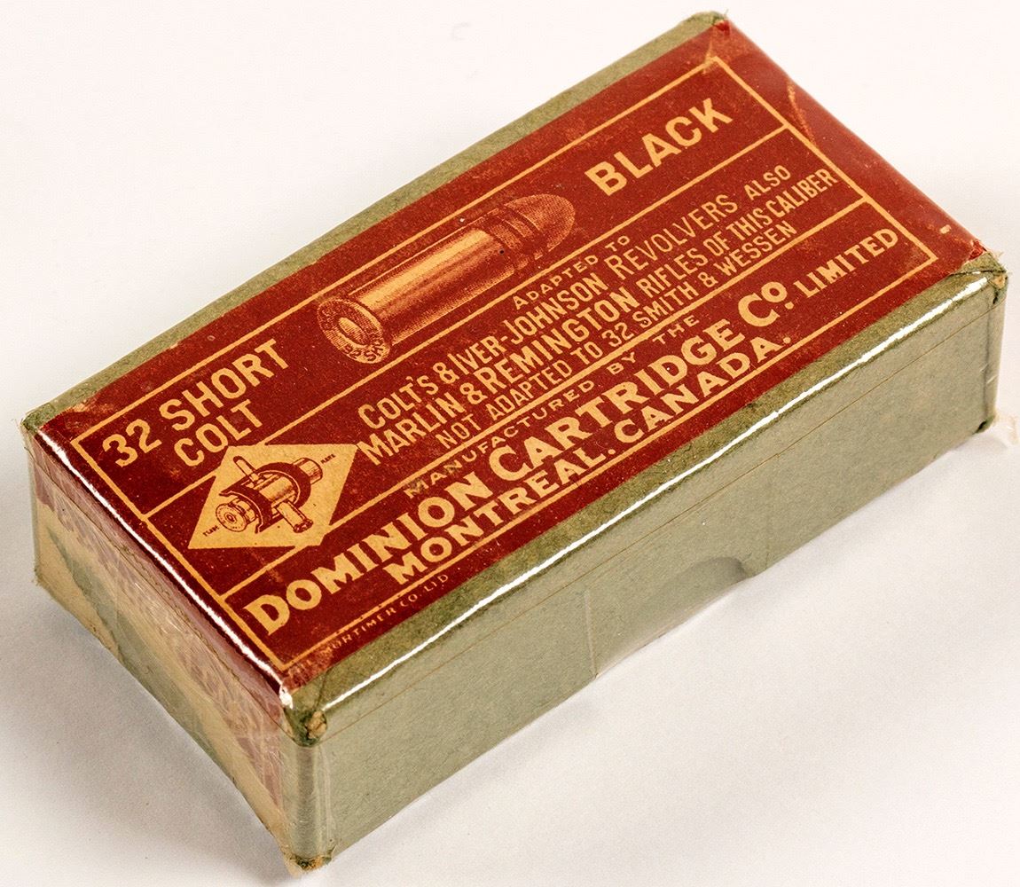 This beautiful box of 50 count .32 Short Colt black powder (center fire) cartridges was made by Dominion Cartridge Co. limited Montreal, Canada. It is a two piece box of green paper with a dark red label. The box has been opened and is very clean and crisp. The Dominion logo is unique with a cartridge crossing though the large "D". The box is marked for "Colt's & Iver-Johnson Revolvers also Marlin & Remington rifles of this caliber not adapted to 32 Smith & Wesson". Clearly Colt had designed their guns to be completely different from S& W evidenced by this box of ammunition. For the serious Colt ammunition collector. ITEM CANNOT BE SOLD TO CALIFORNIA BUYERS. Date: Location: HWAC# 55261
