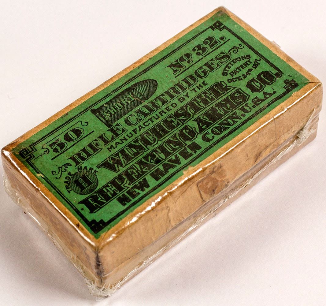 This two piece picture box of .32 short cartridges was made by Winchester Repeating Arms Co. for post-Civil War vintage pocket pistols. This box is marked "50 (count) No. 32 short"and "Rifle cartridges Manufactured by the Winchester Repeating Arms Co.New Haven Conn. U.S.A." It is also marked "Stetson's Patent Oct. 24th, 1871". This box of ammo. fits most .32 caliber short five shot and six shot pocket pistols. If you need ammunition for your vintage guns to display, this is for your office or den. ITEM CANNOT BE SOLD TO CALIFORNIA BUYERS. Date: Location: HWAC# 55262