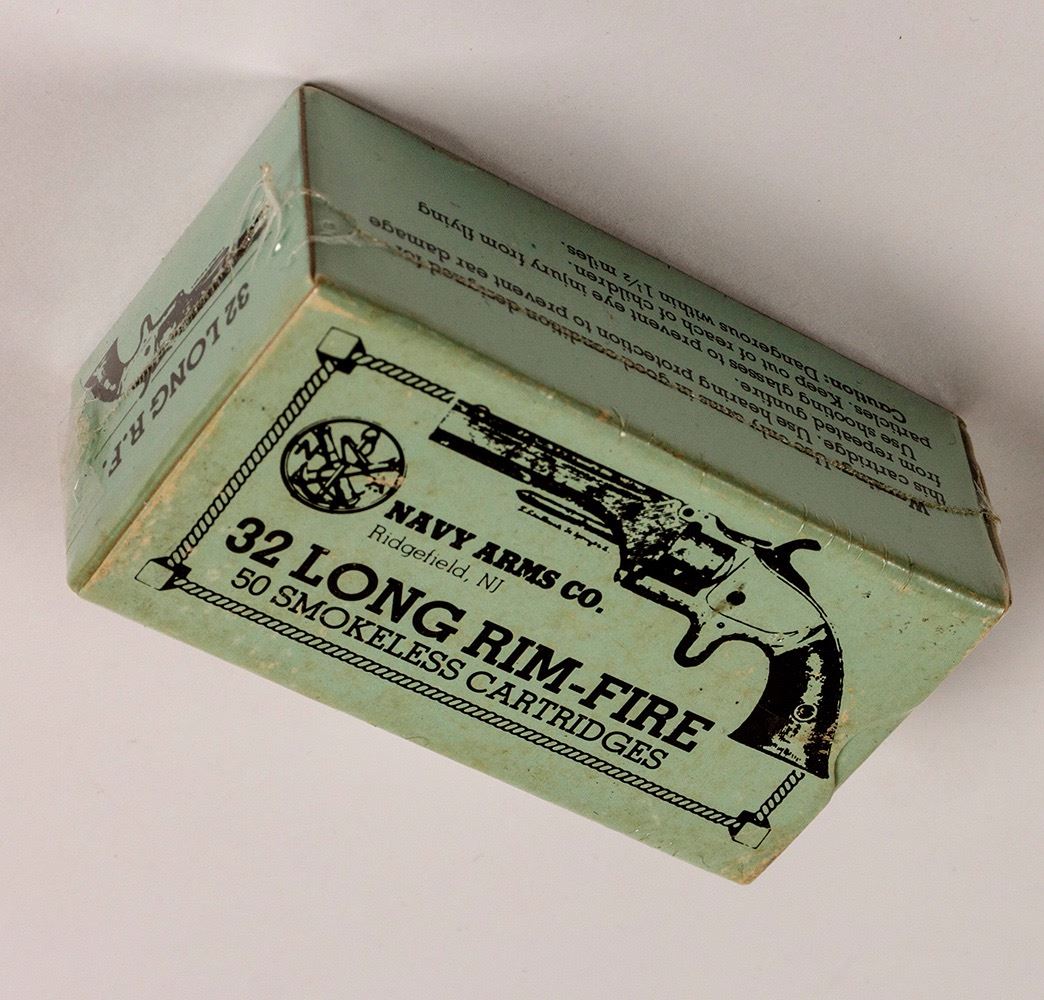 This is a box of 32 caliber rim-fire cartridges a 50 count of smokeless cartridges for Navy Arms by CBC of Brazil. The box is a single piece of light green paper and black lettering. A vintage S & W #1 pocket pistol is depicted on three sides. Vintage 1970's manufacture. ITEM CANNOT BE SOLD TO CALIFORNIA BUYERS. Date: Location: HWAC# 55379