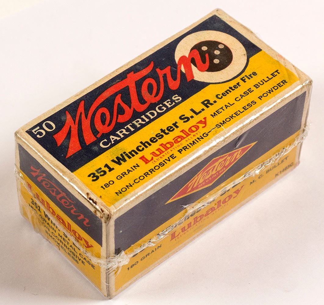 This is a box of 50 count .351 caliber cartridges for the Winchester model 1907 Self Loading Rifle. A rare box of ammo for a rare firearm; this box in blue and yellow with "180 grain metal case non-corrosive smokeless bullets". A "Lubaloy" bullet that never caught on. For the collector of turn-of-the-century rifles. ITEM CANNOT BE SOLD TO CALIFORNIA BUYERS. Date: Location: HWAC# 55255