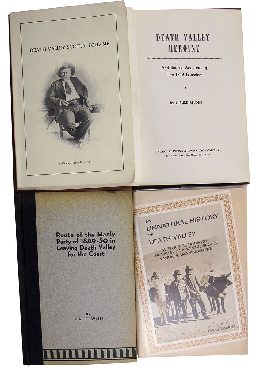 Lot of four Books includes: 1) An Unnatural History of Death Valley (with reflections on the valley’s varmints, virgins, vandals and visionaries), By Paul Bailey, Chalfant Press. Illustrated by Bill Bender. Intact dust jacket. 1906. 2)Route of the Manly Party of 1849-50 in Leaving Death Valley for the Coast, By John E. Wolff, no publisher mentioned. No dust jacket. Article published in 1940 regarding death of author in Nev. Desert is included. 3) Death Valley Scotty Told Me, By Eleanor Jordan Houston, Chalfant Press. No dust jacket. 1985. 4) Death Valley Heroine, By L. Burr Beldon, Inland printing & Engraving Company 1954