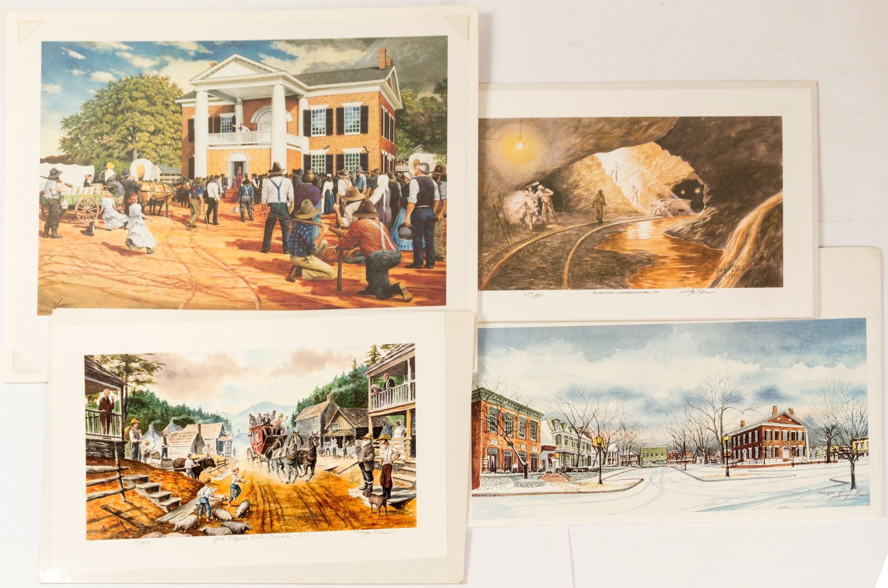4 color prints, all are signed by artists. Gold Digger Road-Auraria-1834, #171/300 by John Kollack, 13 x 19". "The Glory Hole"-Consolidated Gold Mine 1904, #659/1000 by John Kollack, 13" x 19". Dahlonega snowy street scene with gold museum and other buildings. Signed by Lorraine Brewer, #166/250, 11.5" x 21". Lumpkin County Courthouse circa 1849 color print by Daniel Shouse. #283/1000, 19" x 22".