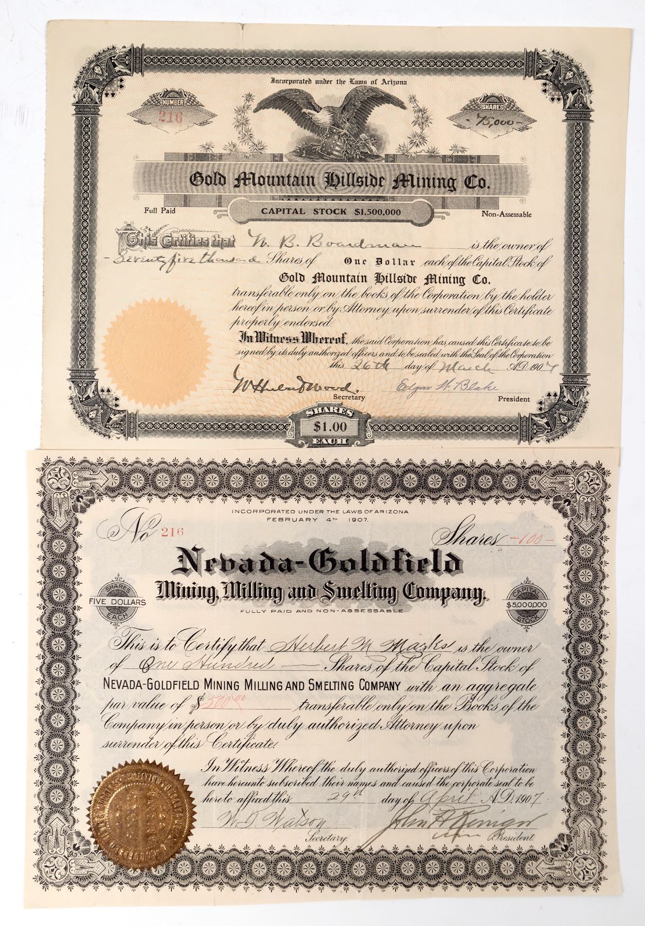 1) COD Cons. Cert. #4954, issued at Goldfield, NV. For 100 shares to David Pfeiffer. Incorporated in 1908. This company was a merger of the Goldfield C.O.D. and the Gold Bar Mining Co. The company was tightly held and controlled by the famous Goldfield Consolidated Mining Company. The claims formed a compact group, 90 acres at Goldfield. Property had a 350' shaft and several thousand feet of workings by 1916. 2) South Nevada Copper. # 191 for 500 shares to A. R. Mensch on December 20, 1906. Three small mining vignettes. Signed by Prior and Hobbs: both local businessmen in Goldfield! This well hyped mining company proved to be a quick bust! 3) Goldfield, Nevada. # 216, issued for 100 shares to Herbert Marks in 1907. In the 1910 Mines Directory, John Sparks (Nevada governor at the time) is listed as president. Company had about 1,000 acres of claims in Goldfield, Tonopah, Lida, Liberty, and Yerington Districts in Nevada. A John H. Reniger was convicted of mail fraud a few years later! 4) Gold Mountain Hillside. # 216 for 75,000 shares issued to W. B. Boardman in 1907. That is one large junk of stocks! Signed by Boardman on reverse. The "Appendix to Journals of Senate and Assembly" Nevada, 1913"references the location as Goldfield. However, there was a Gold Mountain Mining District (the Divide) between Tonopah and Goldfield?