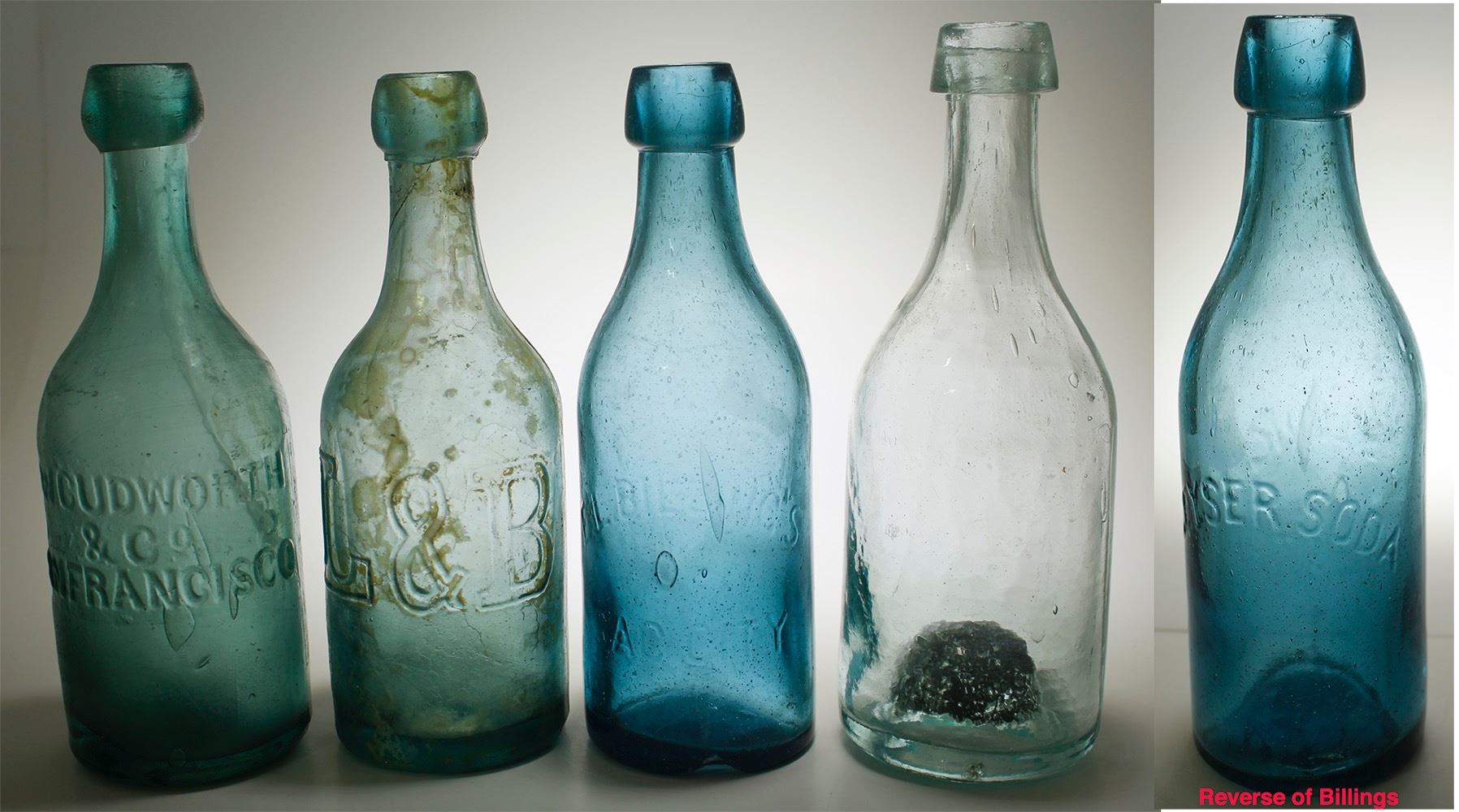 Aqua L & B. Neck scratch and base bruising. Aqua unidentified. Aqua A. W. CUDWORTH/ & Co./ SAN FRANCISCO. Dark blue GEYSER SODA/ SAC CITY. Large base chip. No visible chips or cracks except as noted. Shamberger collection. City: State: California Date: HWAC# 50118