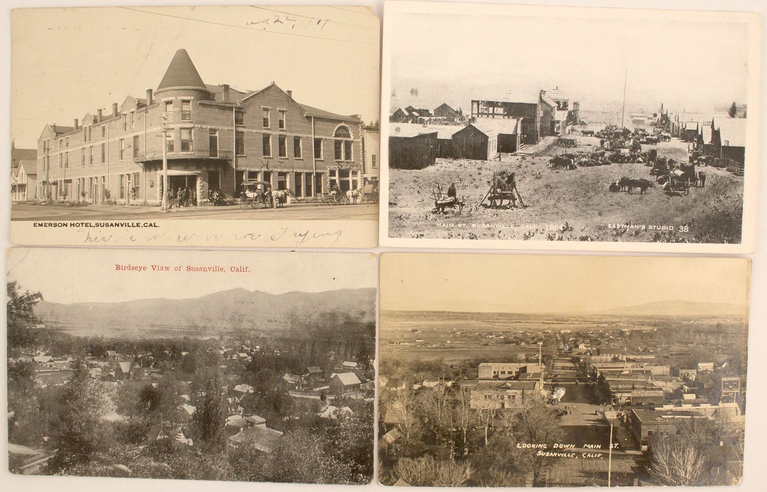 4 real photo postcards with images from Susanville, CA. Main St. 1864(reprinted), Birdseye view from a hill, looking down Main St., Emerson Hotel postmarked 1907. HWAC# 51000 Date: Location: Susanville, California