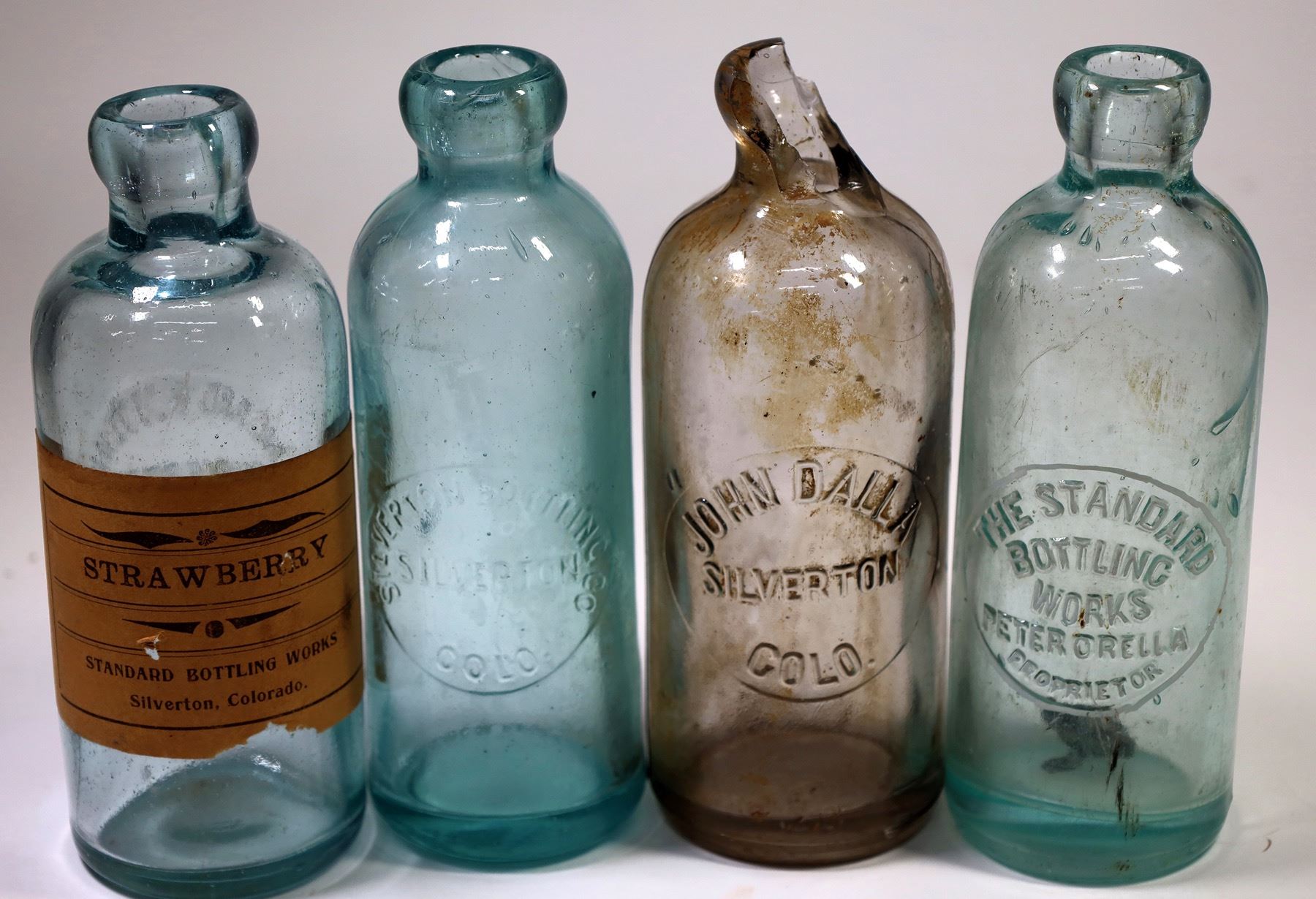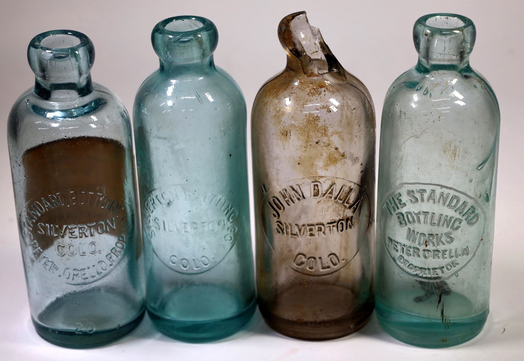 4. STANDARD BOTTLING/SILVERTON/COLO./PETER ORELLO/PROP. Aqua, 6 1/2" tall. The number 20 is marked on the front of the bottle near the base. The bottom of the bottle has an oval with a line through it. Paper label on reverse of bottle: STRAWBERRY/STANDARD BOTTLING WORKS/Silverton, Colorado. Label is 95% whole with a couple 1/4" tears in the body of the label. The bottle is clean with no visible damage - very near mint. Preble S290