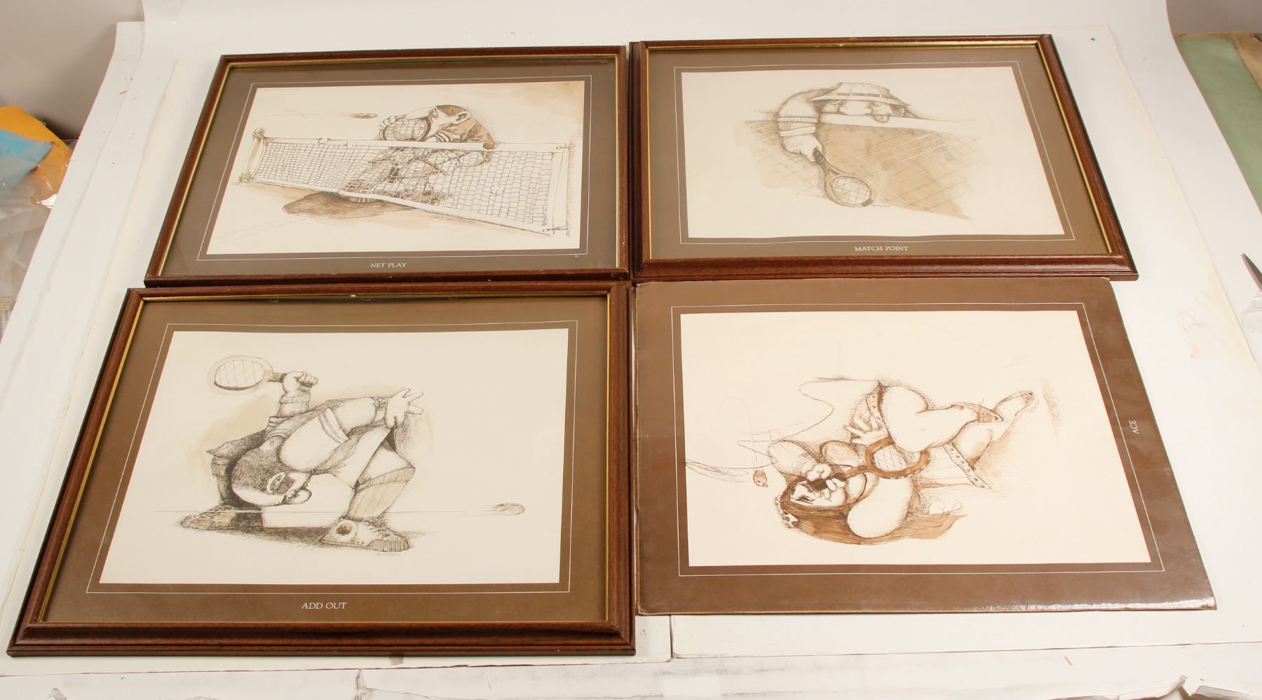 Vintage Gary Patterson print, tennis them: Match Point, Ace, Net Play, And Out. Each is matted 16" x 20"and three are framed, 17.75" x 21.75". Circa 1970-1973. Gary Robert Patterson (born 1941) is an American cartoonist known for his distinctive works that humorously depict the potential pitfalls inherent in sports, the daily dramas that occur at the workplace, and hilarious portraits of pets - all in predicaments that help people appreciate and laugh at the lighter side of life. (wikipedia).