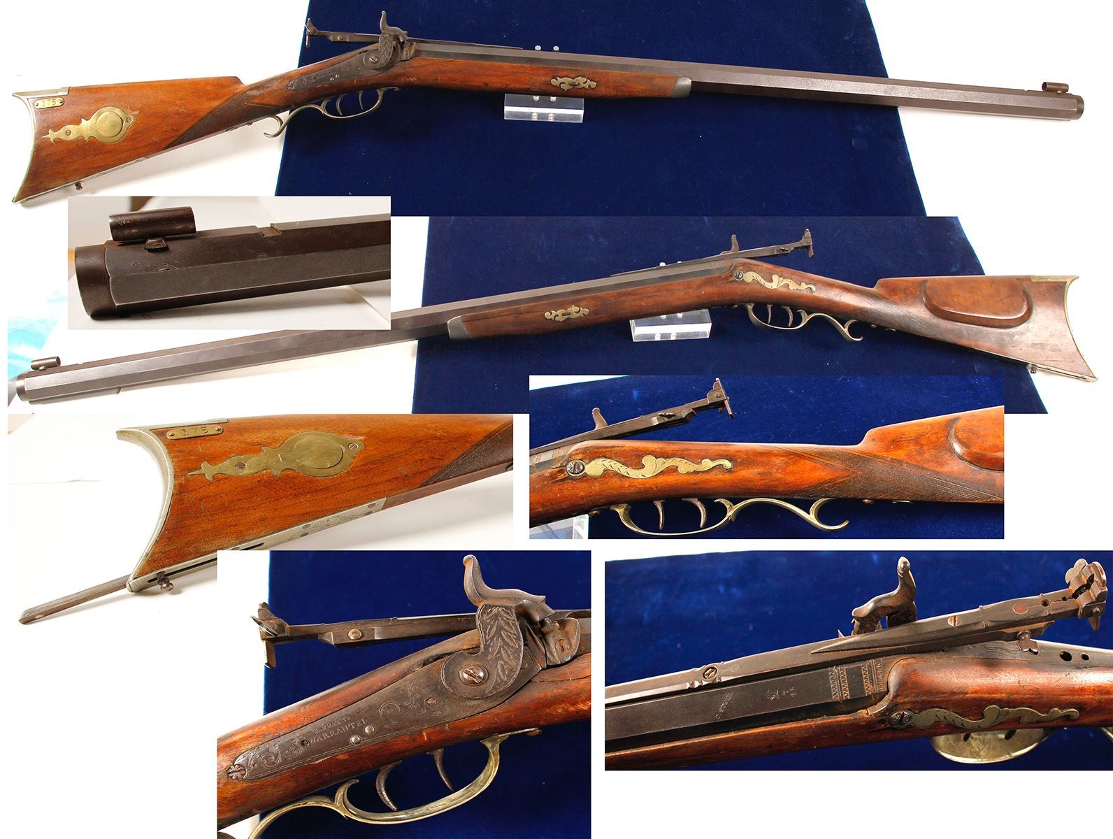 This is a .42 caliber Pratt target rifle marked from Concord, Mass. The barrel is 32 in. overall length with a patent hook breach for cleaning. It is 1 1/4 in. across the flats with a round turned muzzle to accommodate a false muzzle now missing. The top flat is marked "A. PRATT. CONCORD. MSS." on three stamped lines (1821-1877). It is also marked "C. (Christian) Steel" the barrel maker along with a turkey bust proofing mark and the numbers "7 over 45"; the meaning unknown, (possibly July of 1845). The gun is equipped with a hooded bead front sight; relocated forward for a longer sighting radius or different dovetail width. The rear sight has been relocated to a sighting plane adjustable for windage and elevation; where the windage plate has incredible side motion and a forward calibrated needle. The most unique feature of this gun is the sliding extension for the curved butt-plate. It is thought that this feature would extend under the shooter's arm pit and act as a butt-plate extension in much the same way as a Schutzen style butt-plate without the obtrusive design. The lock is a back-action marked "A. PRATT Warranted". The stock is half-stock with a pewter nose cap; cracked in several places forward of the lock and behind the nose cap. It has double set triggers that still function. The stock has one wedge and brass stock escutcheon, cheek-piece and a small cap box mounted forward opening. There is a brass number tag #175 at the butt-plate. The trigger guard is engraved with the forward extension missing. The bore is smooth without flaws with a very rapid rate of twist that would indicate this gun was made to shoot very heavy bullets. An overall weight of this gun must be between 12-14 lbs. This gun appears to have been built for bench rest shooting in front of the Schutzen craze of the 1890's. Date: Location: HWAC# 55279