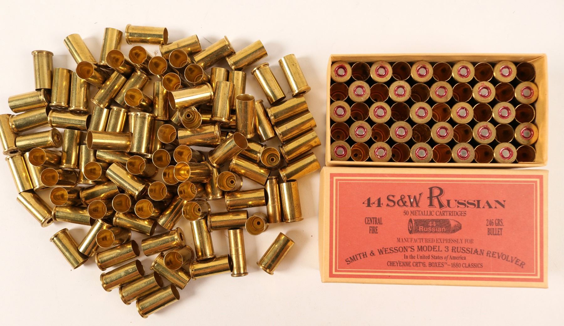 This is a two-piece replica box of .44 cal. Smith & Wesson Russian revolver ammunition made by Cheyenne Cartridge Co. and approximately two-hundred rounds of Star-Line un-fired brass of the same caliber. No sales to California, Hawaii, New Jersey, Connecticut, and New York City.