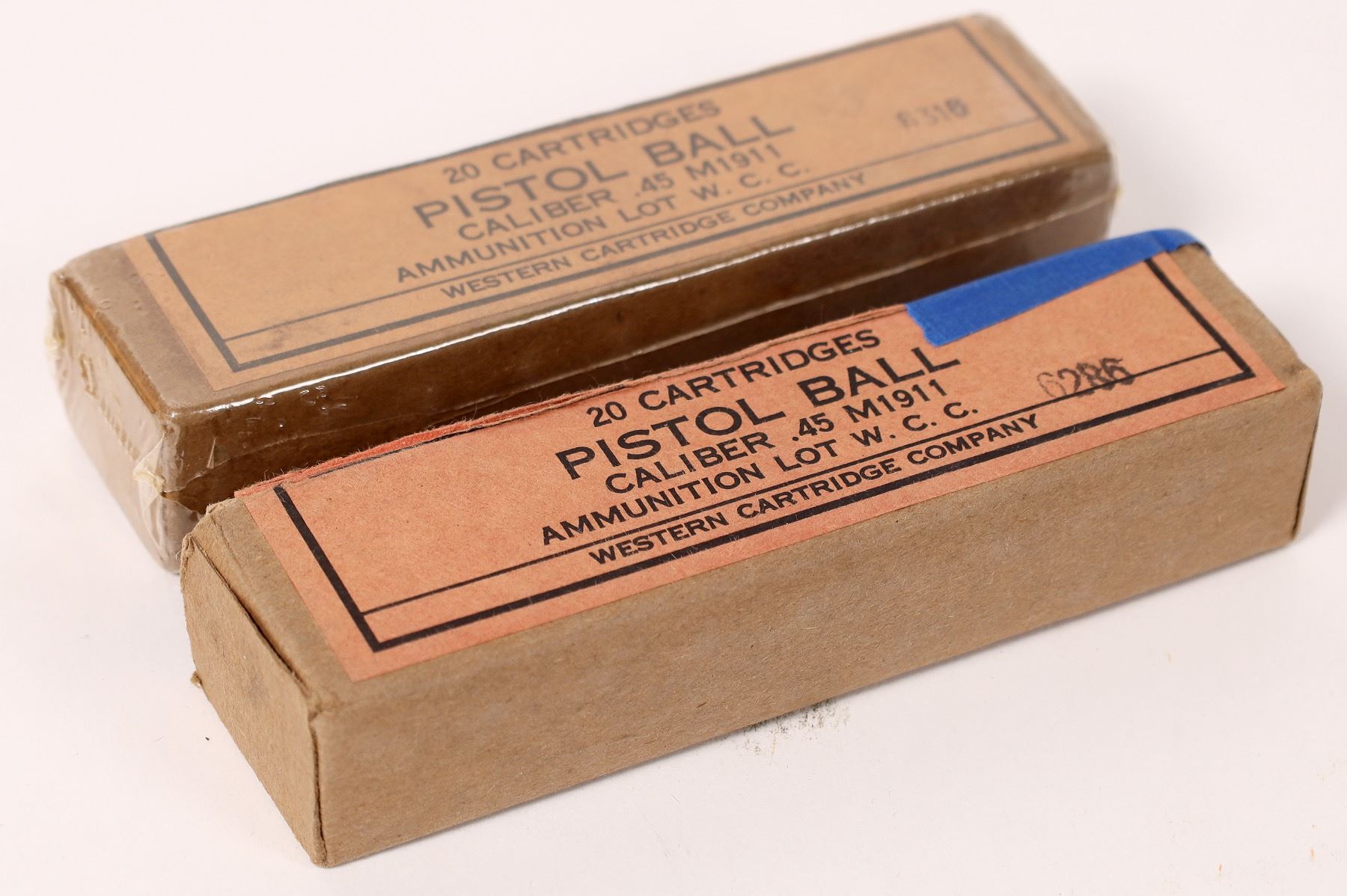 This lot contains two boxes of "20 cartridges" for "Pistol Ball/ Caliber .45 1911/ Ammunition Lot W.C.C./ 6286" and a second unopened box is marked "6316". The opened box marked 6286 has 16 rounds marked "WCC 42". Indicating a manufacture date of 1942. Rounds are sealed at the primer. No sales to New York, New Jersey, California, Hawaii. No international sales. Now have the ammunition to match your army issued 1911. Additional shipping fees apply. Must be 21 years of age to purchase. Please see photos for details.