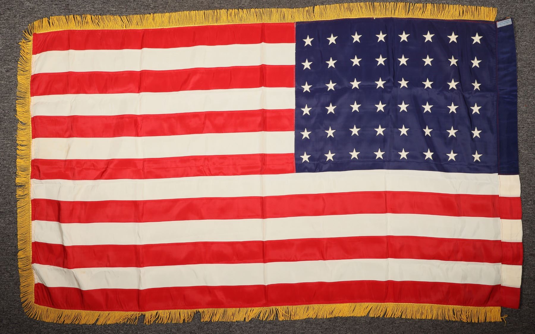 3x5". 48 star ceremonial American Flag w/g old fringe , possibly military. In Excellent condition. 48 star is pre-1959.