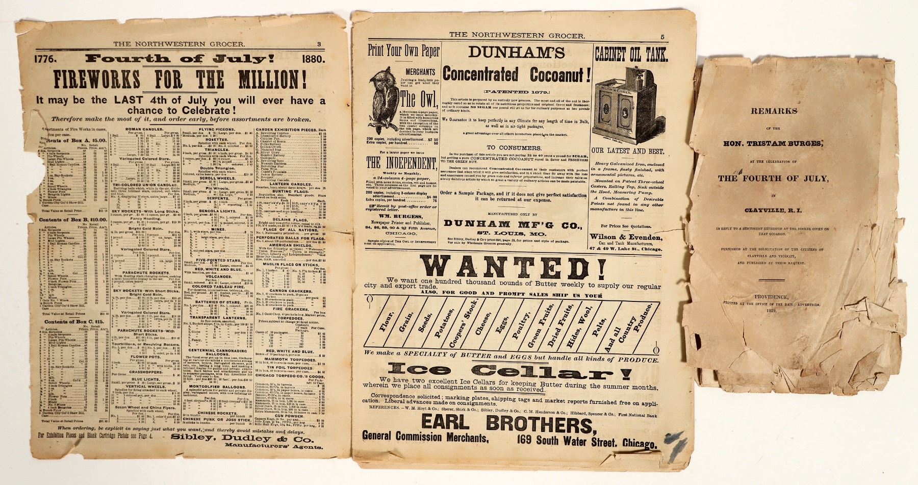 Lot of 2. 1. The Northwestern Grocer newspaper, 1880. Headline "Fireworks for the Millions".. 2. Clayville R.I. Forth of July remarks by Hon Tristam Burges to the people. This is in "tattered" condition and fragile.