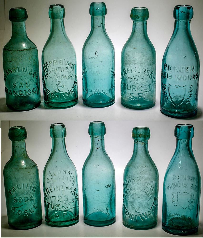 CLASSEN & CO/ SAN FRANCISCO// PACIFIC SODA WORKS. 2 small base bruises. PIONEER SODA WORKS/ TRADE MARK. Inside neck bruise. EMPIRE SODA WORKS/ SAN FRANCISCO. 2 small chips on rear. 2 x C. A. REINERS & CO/ 723/ TURK ST. S.F. // IMPROVED/ TRADE MARK/ MINERAL WATER. Crescent moon and 3 stars. No visible chips or cracks. Shamberger collection. City: San Francisco State: California Date: HWAC# 50124