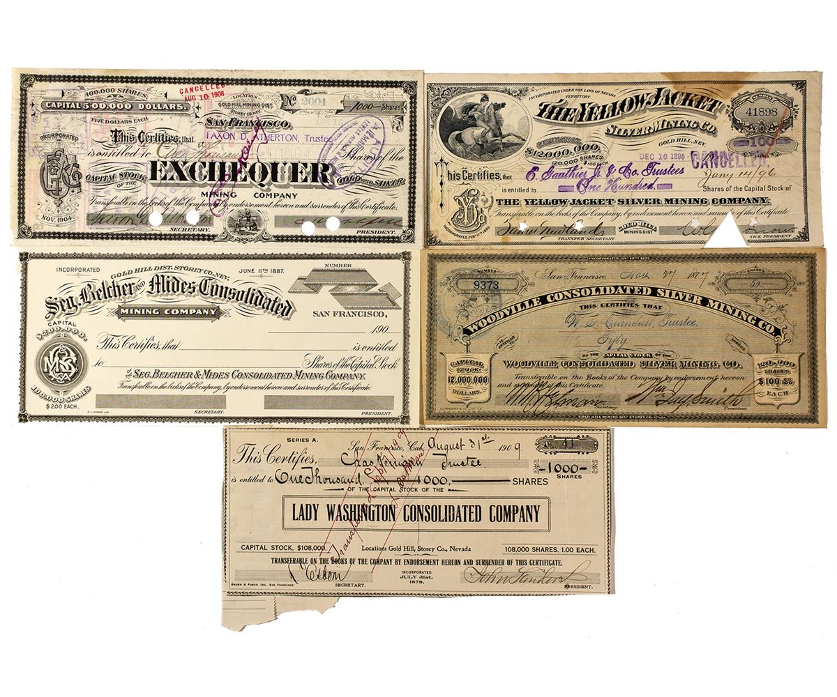 Lot of 5 from the 1). Woodville Consolidated Silver Mining Company, dated 27 November 1877, for 50 shares at $100 each. Issued to W. G. Crandall and signed by William Jay Smith, president. The secretary’s signature is illegible. 2). Issued by the lady Washington Consolidated Company, dated 31 August 1909, for 1,000 shares at $1 each to Charles Kerrigan. Signed by John Landon, president and L. Osborn, secretary. 3). A blank certificate from the Seg. Belcher & Mides Consolidated Mining Company. Shares are $2 each and there are no signatures. 4). Issued by Exchequer Gold and Silver Mining Company to Faxon D. Athertonfor 1,000 shares at $5 each. Signatures of both the secretary and president are illegible. The certificate was cancelled on 10 August 1908. 5). Issued by The Yellow jacket Silver Mining Company on 14 January 1896 to E. Gauthier Jr. & Company for 100 shares at $100 each. While the company vice president’s signature is illegible, the transfer secretary’s signature is by James Newland.