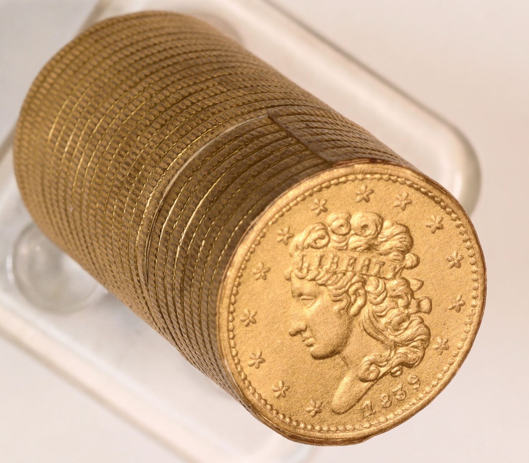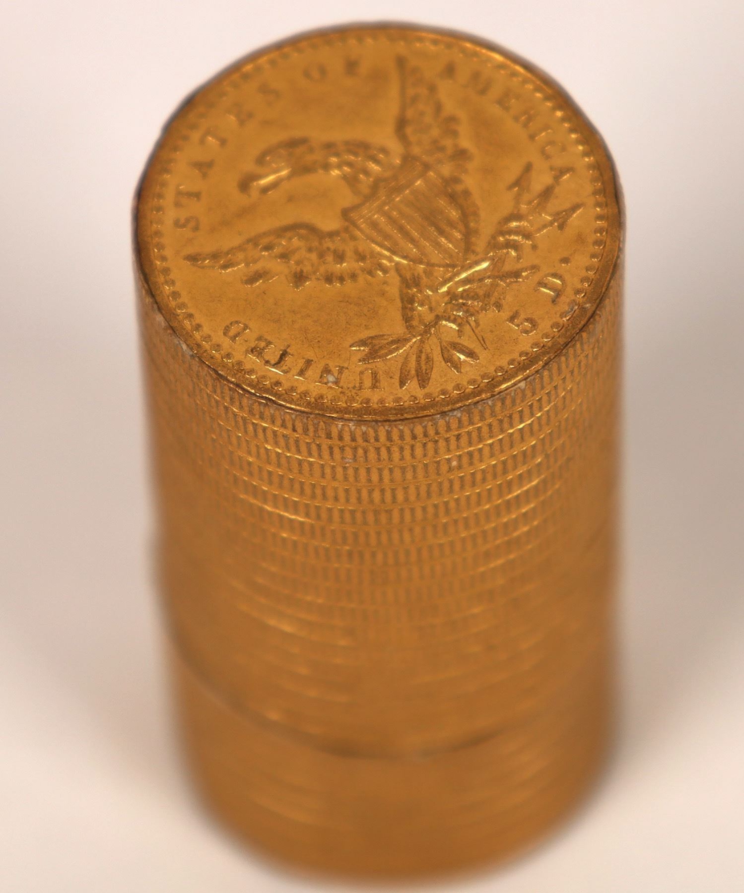 Container has Liberty $5 obv and rev, dated 1839. Novelty as it looks like a roll of 25 coins. In excellent condition. May have held counters. Hunted the internet and couldn’t find another like it. Be worth searching.