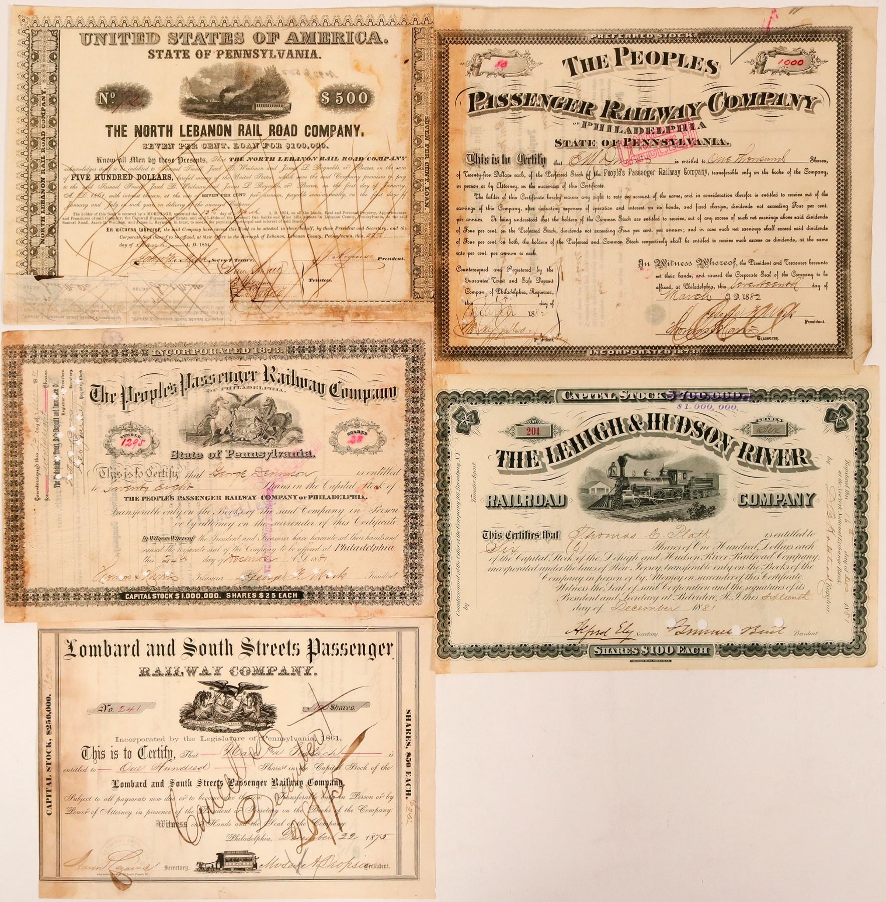 5 certificates. 1. The North Lebanon Rail Road Co..Incorp. 1850 . #92, I/C, $500, 7% loan issued March 1854. Black, vignette trian r-l. Three coupons attached. VF 2. Lombard and South Streets Passenger Railway Co. incorp 1861. #241, I/C, $50 par, issued Dec. 1875, Black, Vignettes: top state seal, bottom horse drawn trolley. Embossed seal, Alexander printer. 3. Two , The Peoples Passenger Railway Co. incorp. 1873. I/C, #1295, Black, $25 par, issued July 1881. state seal vignette and #83, $25 par, embossed seal, Black, no vignette. Issued March 1882. VF 4. The Lehigh & Hudson Railroad Co. incorp. 1881. #204, I/U, $100 par, issued Dec 1881, Black, vignette 4-4-0 , embossed seal, Frank Lee Bank Note Co. VF