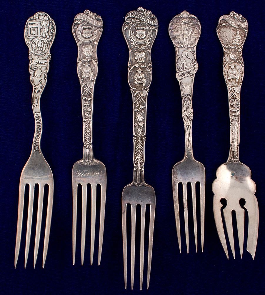 1 made by E. L. D. Denver, front die struck--mining scene and Indian, "Wyoming"; 2 "Colorado", similar mining scenes on handles; 1" California", die struck mining scene with "Big" tree; "Iowa", die struck with miner and corn stalk. State: City: Date: FHWAC#: 37806