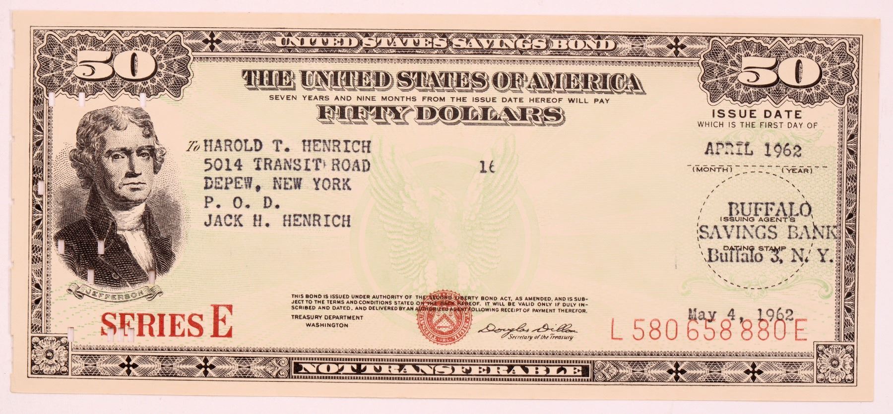 Issued April 1962, vignette of Jefferson, by the Buffalo Savings Bank of Buffalo New York. 7 x 3 inches