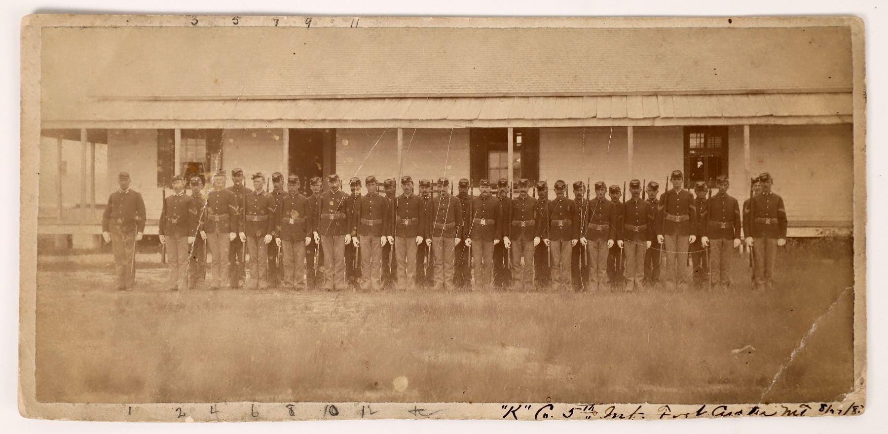 Company “K”, 5th Infantry at attention in front of their barracks at Fort Custer, Montana. Photo shows age and is a little light. Back has list of the soldiers (also light and difficult to read some places). Fort Custer was established during the Indian wars in the Department of Dakota by the U.S. Army to subjugate the Sioux, Cheyenne and Crow Indians near present-day Hardin, Montana. The post was named for General George Armstrong Custer who died at the Battle of the Little Big Horn. Custer Montana