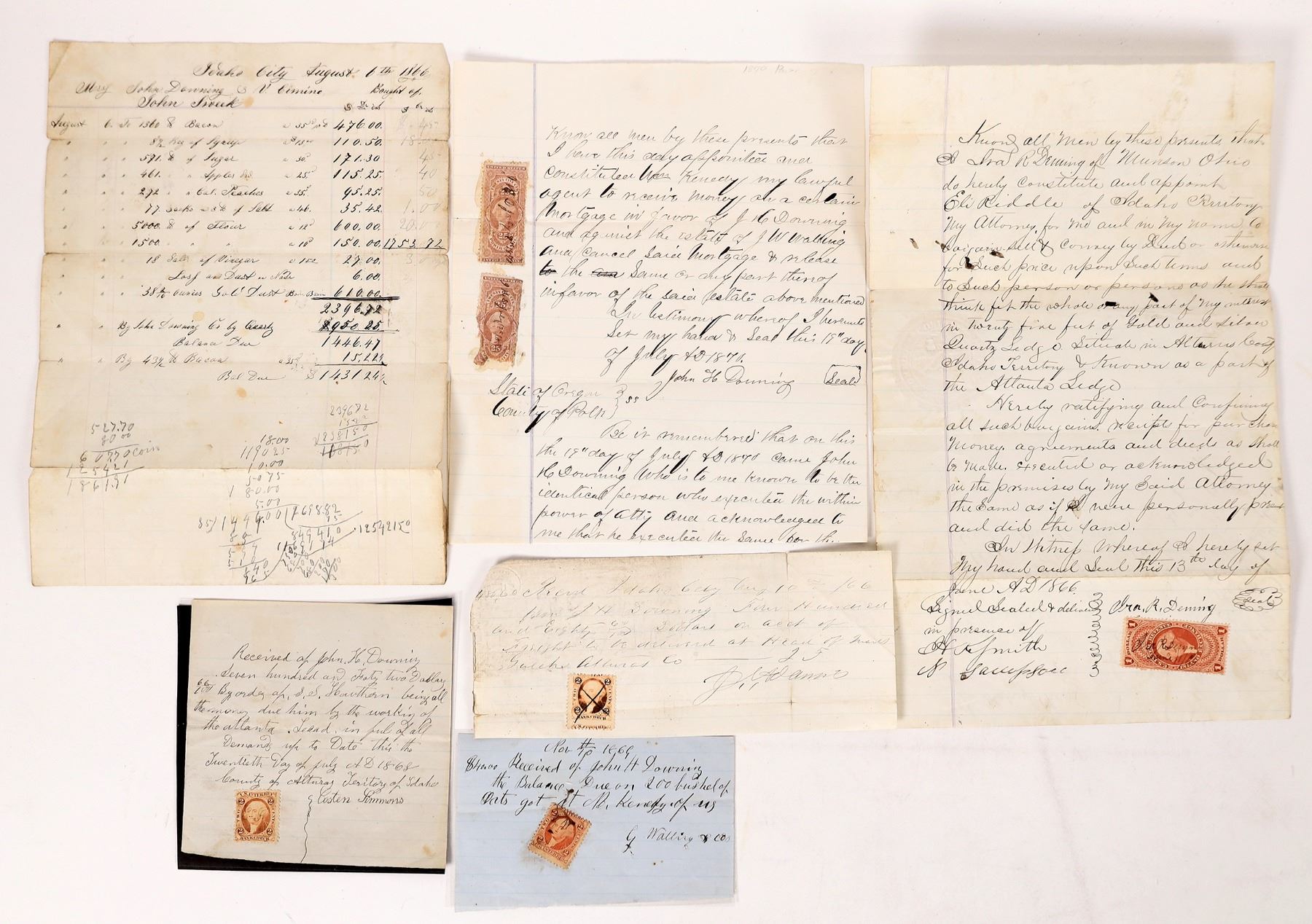 Collection of Mining Documents from the Atlanta Lode out of Middle Boise Mining District, Idaho; All papers are regarding John H. Downing, a miner who owned part of the famous Atlanta Lode. He figures prominently in all papers associated with the Atlanta Lode and Quartz strikes in the mid 1860's in Idaho Territory. The first 4 items are all revenue stamped documents: 1) An 1868 receipt on a mining contract, acknowledging that John Downing paid S.S. Hawthorn $742.66 for working the Atlanta Lead. Signed by Costen Simmons on Jul 20, 1868. 5" x 5". 2) A receipt for freight to be delivered at "Head of Quartz Gulch"(which later became known as the Atlanta) to John H. Downing for $480.60 on Aug 10, 1866. Signed by J.C. Adams. 3) Rare receipt for $150 from Nov 10, 1869, stating that John H Downing has paid the balance due on 200 bushels of oats at "M. Kennedy of US". Signed by G. Walling & Co. printed on blue notebook paper, a torn off end piece. 3.25" x 5.25". 4) An 1870 document stating the appointment of Wm Kennedy by John H Downing to act as Downing's agent in collecting money on a mortgage against the estate of J. Walling, etc. (Note that the signer on No.3 above is the Walling Co.). By 1870 it seems that Downing has moved away from Idaho and is now in Polk County, Oregon. 8" x 12". 5) Receipt for supplies dates Aug 6, 1866 which Downing purchased in Idaho City from John Sweek (handwritten billhead) showing part of the transaction was paid by 38oz of Boise Basin Gold Dust and Gold quartz. 8.75" x 8.5". This is a wonderful example of the sorts of supplies that miners needed. Its a rare document from Idaho City! This collections of Idaho Territory docs is notable for its early dates, Idaho did not become a state until Jul 3, 1890, and its inside it provides on the famous Atlanta Lode. Its history has its shares of ups and downs, due primarily to lack of production/extraction techniques and poor accessibility and transportation. From its discovery in 1864 until 1930's the Atlanta Lode was "Big". Between 1932- 36 the Atlanta Mining District became Idaho's leading gold producer.[Ref: Gold Camp & Silver Cities, by Merle W. Wells, Idaho Department of Lands, Bureau of Mines and Geology, Moscow, ID, Bulletin 33, 2nd ed., 1983, pp. 53-63] Franklin Collection.