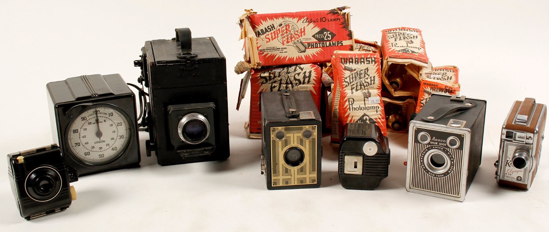 Keystone Olympic 8mm movie camera, Anso Sure Shot, Six-20 Brownie Junior, Baby Brownie, Baby Brownie Special, Graflex R.B. Series B. Standard Electric timer with clocklike face. 9 assorted unused Wabash Superflash bulbs in original cardboard sleeves. Cameras are sold as is. HWAC# 61345 Date: Location: