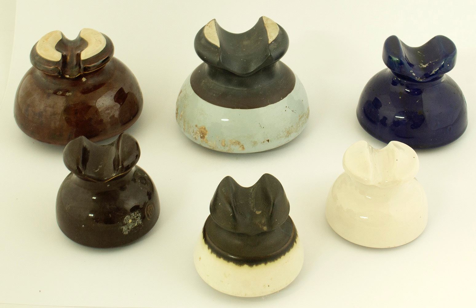 Assortment of 6 ceramic insulators, 4" to 6" wide. Cobalt, brown, white 2 tone. HWAC# 50835 Date: Location: