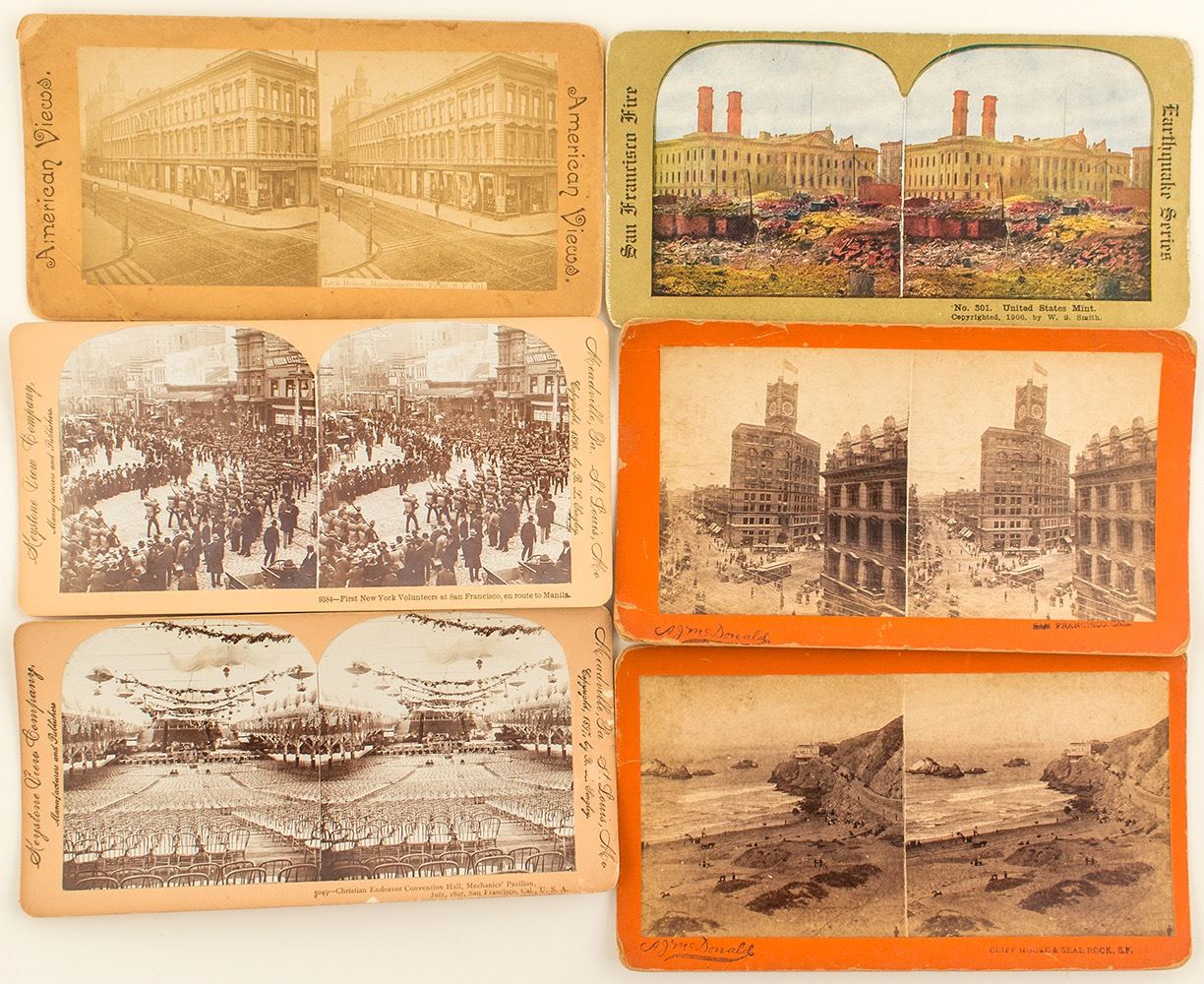 6 stereographs: 1) Earthquake and Fire Series, 1906 (hand colored) 2) Lick House, Montgomery Street; 3) Cliff House and Seal Rock; 4) Christian Endeavor Convention Hall, Mechanic's Pavilion, July 1897; 5) SF buildings and cable cars; 6) New York Volunteers at San Francisco en route to Manila, 1898. State:California City:San Francisco Date: ID#44011