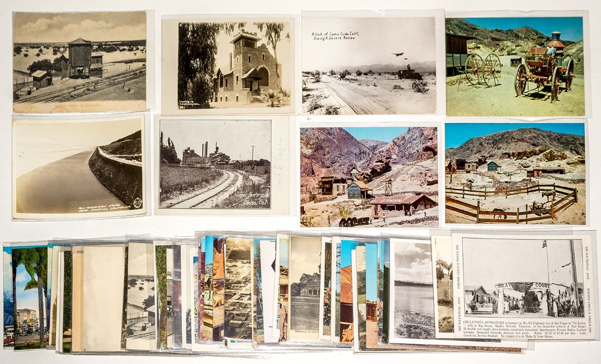 11 RPC's: Unit of Camp Cooke during a Desert Review, At Biskra Palms, Coachella Valley, Writings of a Prehistoric Race on Coral Covered Rocks at Travertine Point, Coachella, Little Lake of Dreams, Glen Abbey Memorial Park, Chula Vista, Crowley Lake, All-American Canal near Calexico and more. 50 b/w and color cards from Cabazon, Chula Vista, Chino, Calexico, Calico, Colton, Cathedral City, Corona, Cucamonga. (Prag Collection) City: State: California Date: ID# 32035