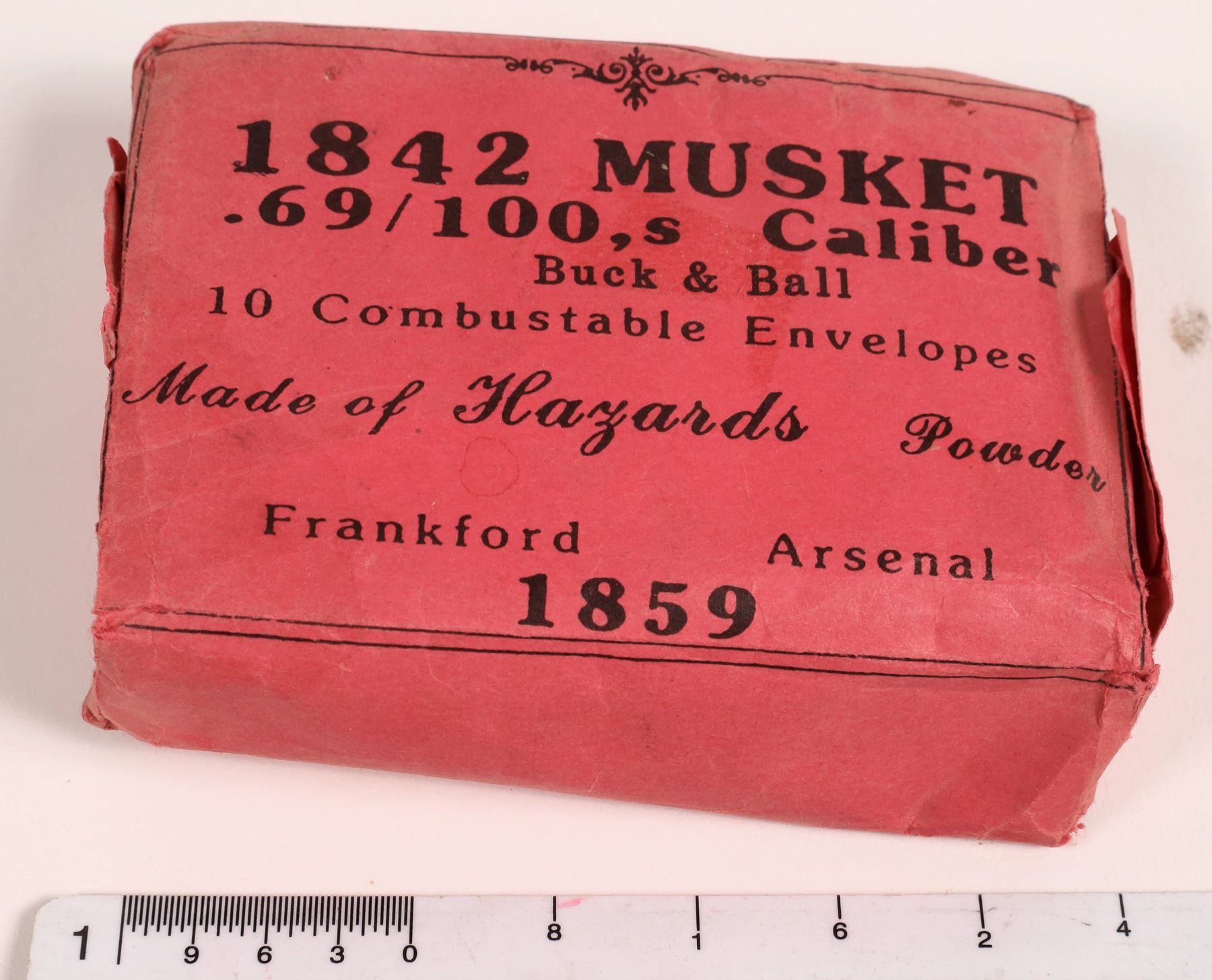 This packet of ammunition holds 10 rounds of .69 cal. buck & ball paper cartridges. The packet is unopened. Made at the "Frankford Arsenal" in Pennsylvania, dated 1859 for the Model 1842 smoothbore percussion musket. "Made of Hazards Powder". This would be the last .69 cal. musket ammunition made before advancing to a rifled musket in .58 cal. for the civil war by the Union Army. However, a sub-contractor moved his gunworks to South Carolina in the 1850s and likely saw service for the Confederate Army as well. In good condition. No sales to New York, New Jersey, California, Hawaii, and Alaska. No international sales. Please see photo for details. Additional shipping fees apply. 3.75 in. X 2.5 in. X 1.125in. From the Sherman collection.