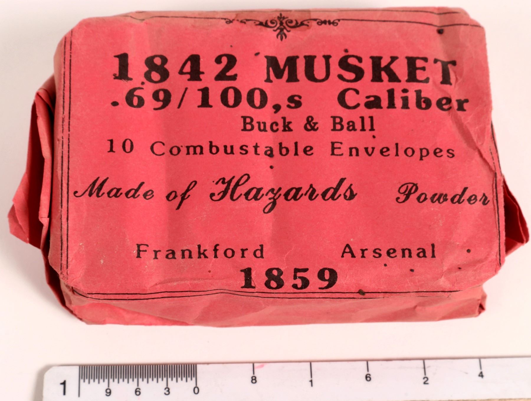 This packet of ammunition holds 10 rounds of .69 cal. buck & ball paper cartridges. The packet is unopened. Made at the "Frankford Arsenal" in Pennsylvania, dated 1859 for the Model 1842 smoothbore percussion musket. "Made of Hazards Powder". This would be the last .69 cal. musket ammunition made before advancing to a rifled musket in .58 cal. for the civil war by the Union Army. However, a sub-contractor moved his gunworks to South Carolina in the 1850s and likely saw service for the Confederate Army as well. In good condition with loose powder. No sales to New York, New Jersey, California, Hawaii, and Alaska. No international sales. Please see photo for details. Additional shipping fees apply. 3.75 in. X 2.5 in. X 1.125in. From the Sherman collection.