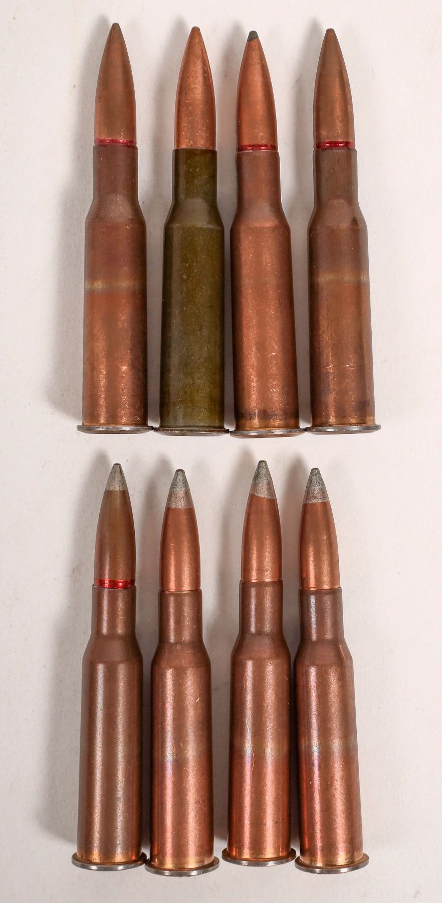 This lot has over 110 rounds of 7.62 X 54 mmR ammunition. This round was used in the Model 1891 Mosin Nagant rifle of the Russian army. The Winchester model 1895 is also chambered for this cartridge. This round was once very popular among long range shooters as well as hunters in the USA. There are about 40 rounds of FMJ (full metal jacketed) bullets, about 75 steel tipped bullets, and several what appear to be hand-loaded rounds. A favorite among Russian snipers and American long range shooters are the 7N1 rounds marked with "188". Many of these rounds are marked "188 61" where 61 indicates the year the round was made in this case 1961. The 7.62 X 54 R is a unique round where the "R" stands for rimmed and it is a chamfered rim at that. These rounds are sold for collectability purposes only. No sales to New York, New Jersey, California, or Hawaii. No international sales. Additional shipping fees apply. Please see photos for details. (ref. Cartridges of the World, 847).