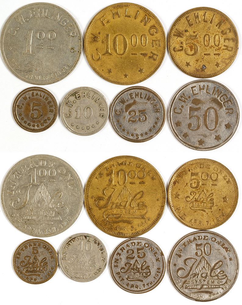 1) Round brass 35mm C. W. Ehlinger / 10oo / 3 stars // ITO /10oo /INGLE SYSTEM / PAT. APR. 7, 1914 2) Round brass 31mm C. W. Ehlinger / 5oo / 3 stars // ITO /5oo /INGLE SYSTEM / PAT. APR. 7, 1914 3) Round white metal 30mm C. W. EHLINGER / 50 / 3 STARS // ITO/ 50 / INGLE SYSTEM /APR. 7, 1914 3) Round white metal 24mm C. W. EHLINGER / 5 // ITO /25 /INGLE SYSTEM / PAT. APR. 7, 1914 5) Round white metal 21mm C. W. EHLINGER / 10 // ITO /10 /INGLE SYSTEM / PAT. APR. 7, 1914 6) Round white metal 35mm C. W. Ehlinger / 1OO / not tranferable // ITO /1oo /INGLE SYSTEM / PAT. APR. 7, 1914 7) C. W. Ehlinger / 5. HWAC# 62536 Date: Location: Ellinger, Texas