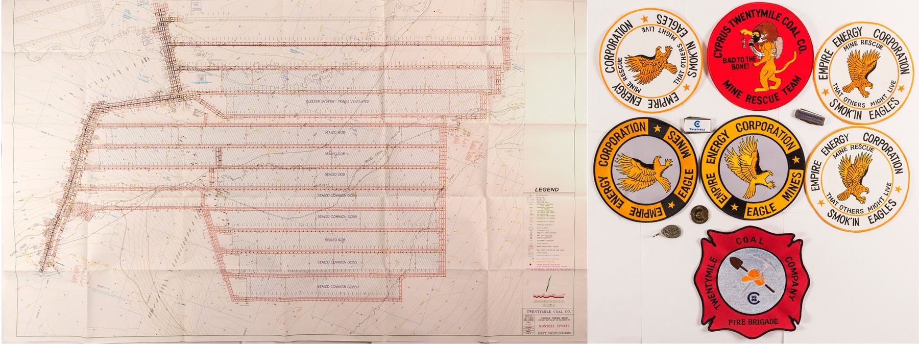 Three 8" EMPIRE ENERGY CORPORATION MINE RESCUE cloth patches. Two 8" EMPIRE ENERGY CORPORATION EAGLE MINES cloth patches. One 8.75" TWENTYMILE COAL COMPANY FIRE BRIGADE cloth patch. One 8" CYPRUS TWENTYMILE COAL CO./ BAD TOT EH BONE/ MINE RESCUE TEAM cloth patch. Very cool patch! Large TWENTYMILE COAL CO. MONTHLY UPDATE map. Twentymile Coal Cyprus key fob. Twentymile combination moneyclip/pocket knife, with BARLOW B80 on reverse. TWENTYMILE 893,108 TONS pendant. 2.25" Twentymile Coal Co./ 1994 Annual Refresher stainless steel pocket multi knife. HWAC# 50321 Date: twentymile coal co. monthly update Location: