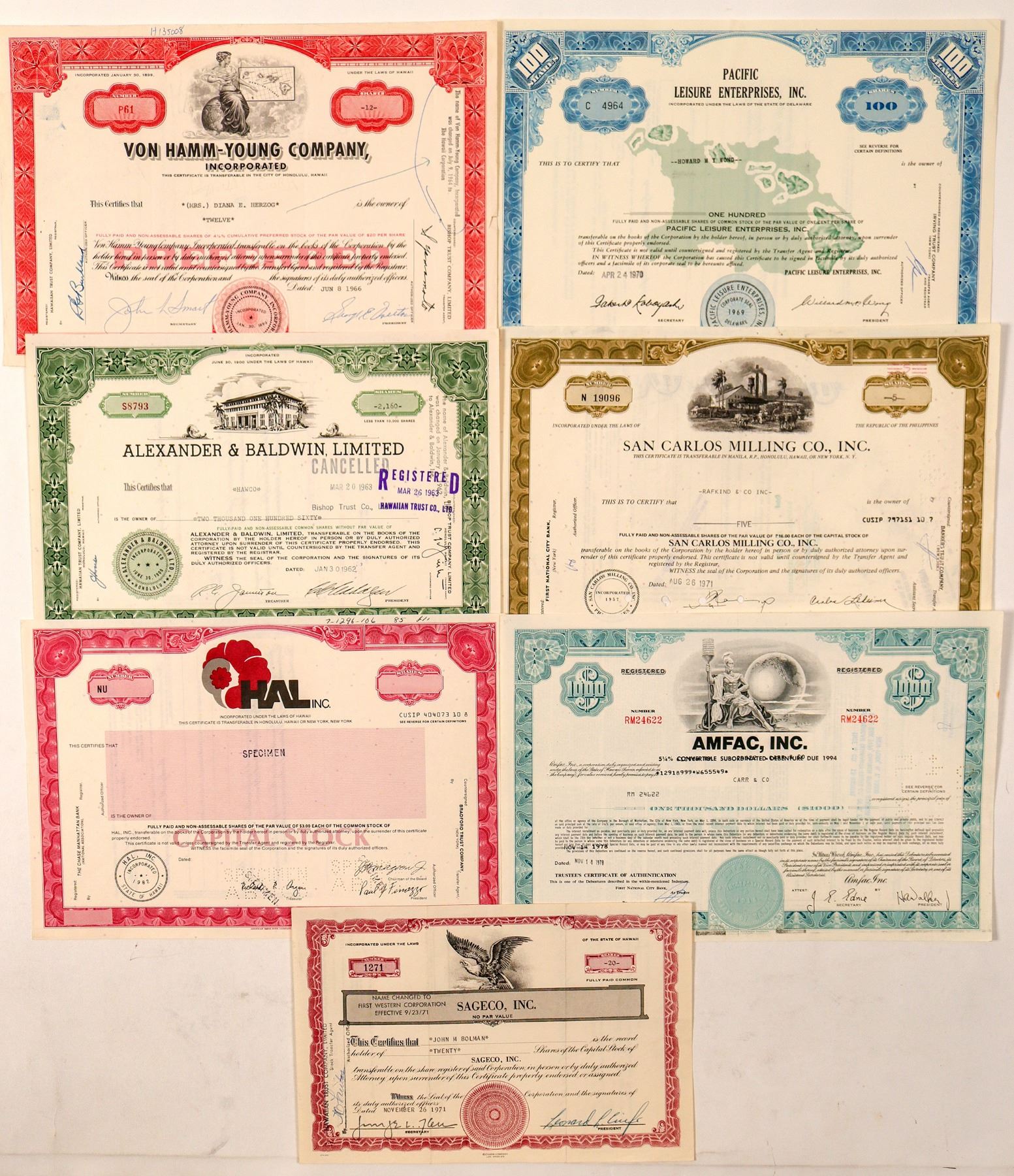 Lot of 7 different. Included: Pacific Leisure Enterprises, Inc. (1970, island vignette); Sageco, Inc. (1971); HAL Inc. Specimen; Amfac, Inc. (1978, allegorical vignette); Alexander & Baldwin, Ltd. (1962, building vignette); San Carlos Milling Co., Inc. (1971, plantation vignette); and Von Hamm-Young Co., Inc. (1966). Ken Prag Collection