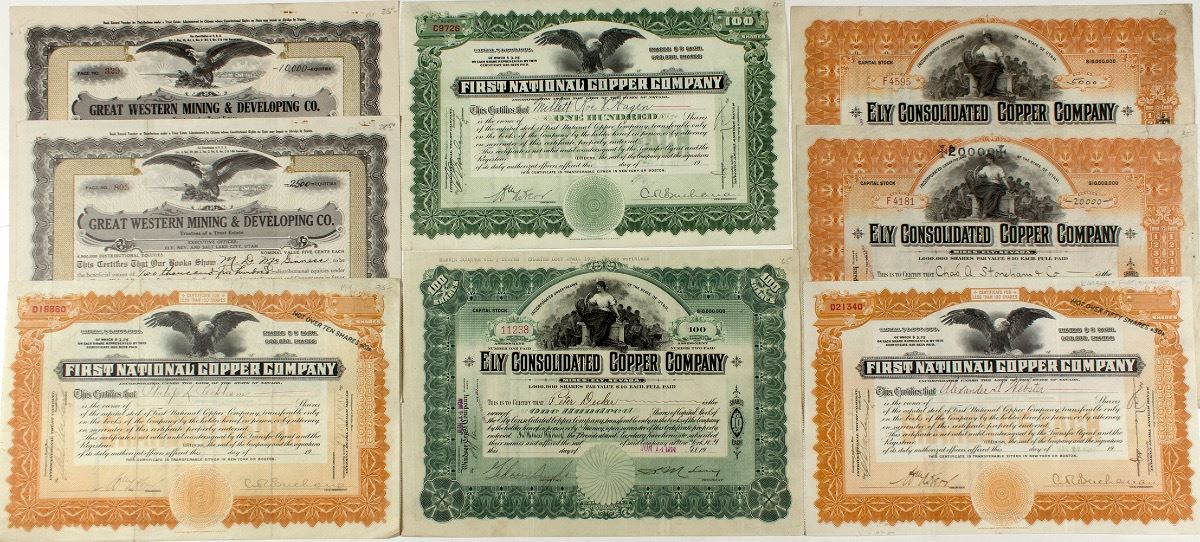 1-3) Ely Consolidated Copper. Light orange. 1910 and 1911. Signed by Gidron Snyder SM Larry(?). One for 20,000 to Charles Stoneham & Company. One green and two orange. 4-6) Three First National Copper Company stocks. 1917. Signed by Kerr and Buchanan. Two orange and one green. 7-8) Great Western Mining & Development. 1929 and 1935. Both issued to May McGinniss for 2,000 and 10,000 shares. Signed by JW Morris and JF Barnhil or Frank Rebock. (Prag collection) City: Ely State: Nevada Date: 1910-1935 ID# 28706