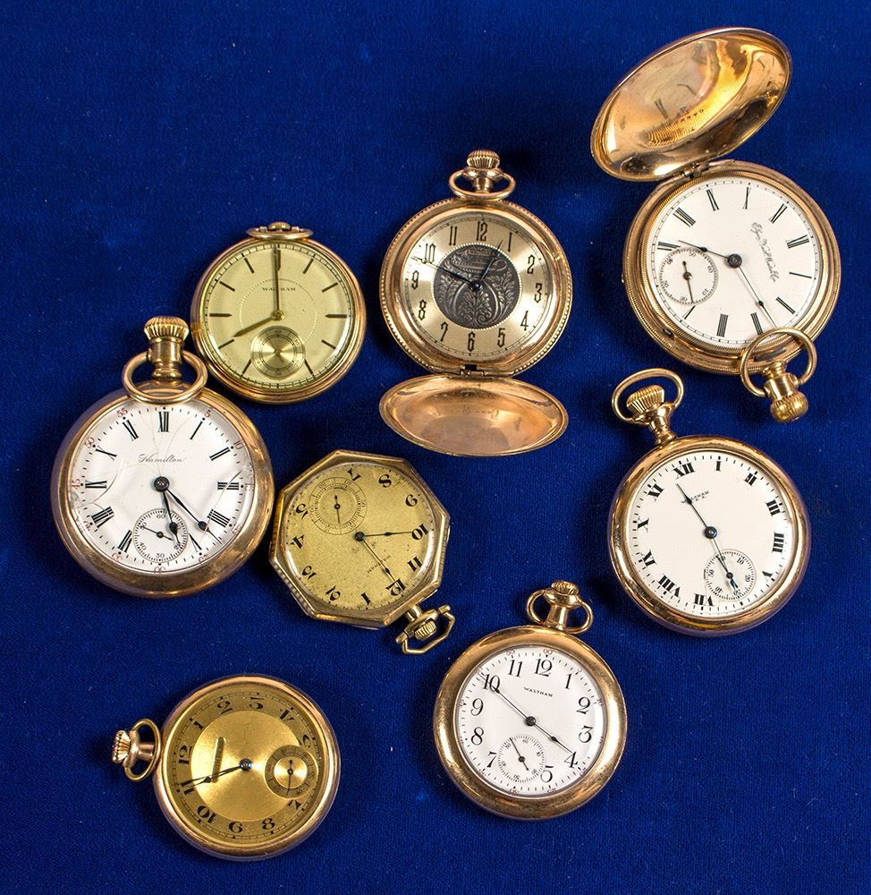 8 gold pocket watches, 1) Elgin Natl. sn 3843173, gold filled?, 2.15" diam, nw; 2) South Bend, panama model,17j, sn411; 3) waltham, octagonal, 15j, sn22858148, runs; 4) waltham, sn 22646155, runs, gf?; 5) waltham, 1.75" diam, 6) waltham (fancy face plate), sn229722771.9" diam engraved case; 7)waltham (broken face glass), 21j, sn590094gf?, 2.2" diam; , 9) waltham, sn15901547, gf?, 1.8" diam. Date: Location: HWAC# 58233