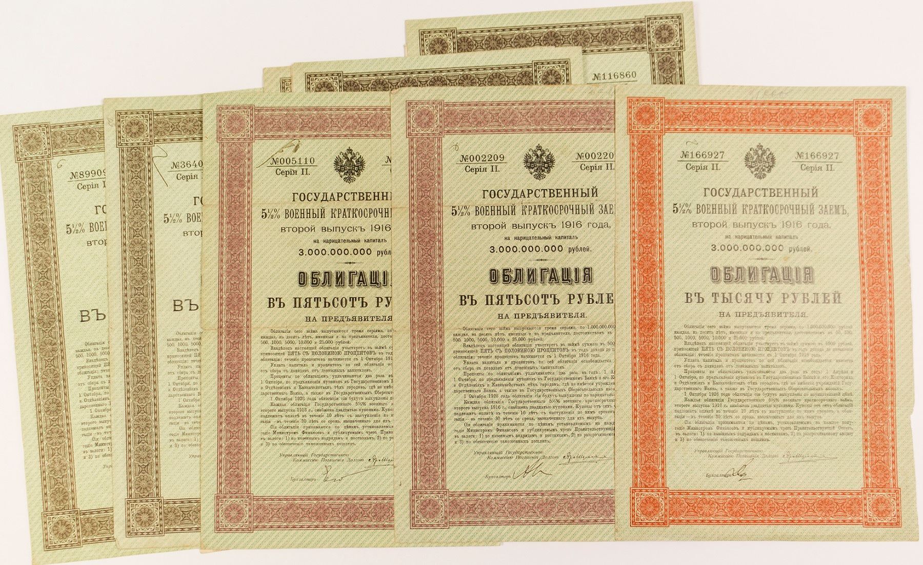 Lot of eight pieces, 3 different bonds: 5 brown, 2 purple, 1 orange-red, with coupons. Date: 1916 Location: zRussia HWAC# 53835