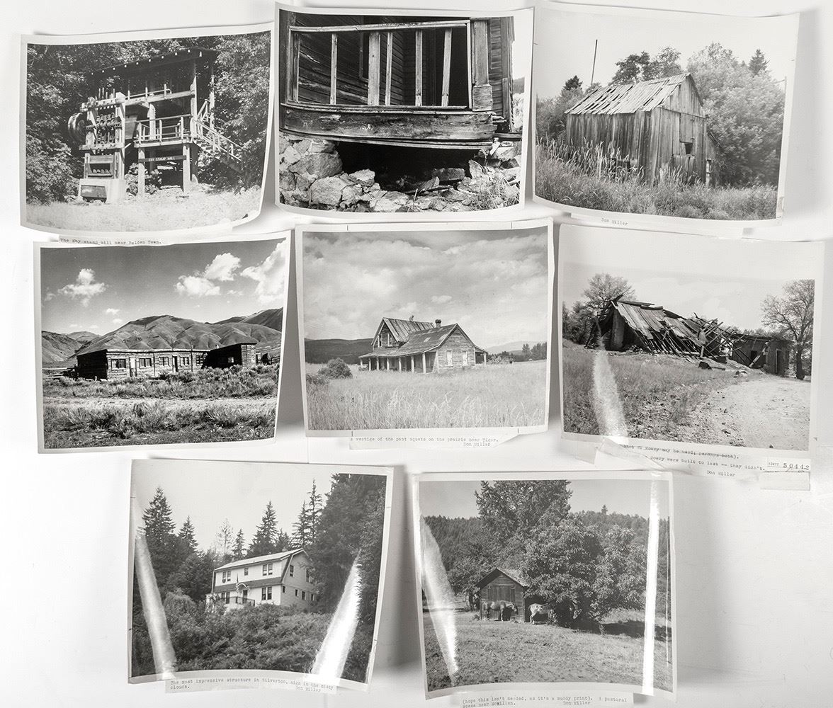Eight 8" x 10" black and white photos. Includes AZ, ID, UT and ND. Mostly older buildings and the Eby Stamp Mill. HWAC# 49510 Date: Location: