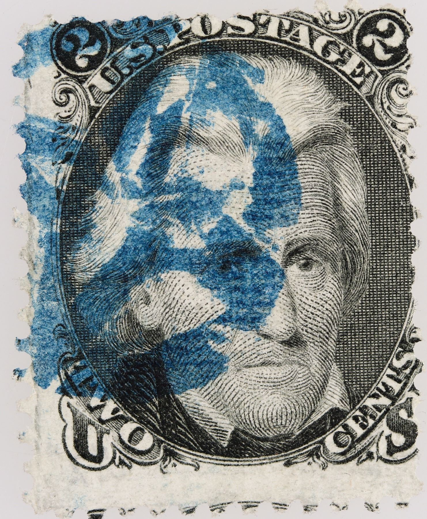 Andrew Jackson 2c "black jack" stamp, printed off center. Used with bold blue cancelation stamp. Perforations are in good condition. Small "z" written in pencil on the back of the stamp. See photo.