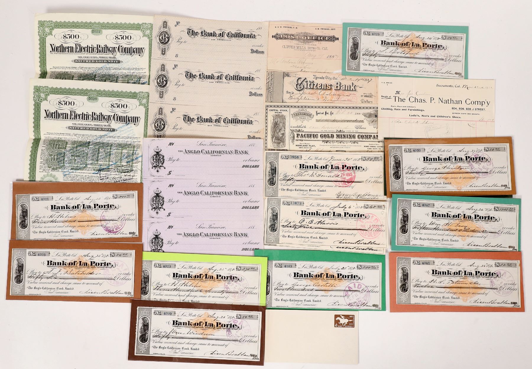 1) 20x Bank Checks from Bank of La Porte, all signed by Dixon Brabban between Aug 27, 1878 and Jun 30, 1885. 2) 2x Northern Electric Railway Co. Gold Notes, 6% over 3 years on $500, Cert. #D520/#D522, 2-fold, both signed by P.M. Sims as trust officer, W.J. Murry as vice president, ass. cashier and bankruptcy cancelled on Jan 26, 1921. Very ornate green border and print, both sides. 3) Blank checks for The Bank of California and the Anglo- Californian Bank Ltd, 3 each, for 188-., both from San Francisco. 4) Stock Certificate from Pacific Gold Mining Company Early Cert.#9, issued to Wm. M. Lowden for $100 shares at $20 each Howland Flat, Sierra County, Ca. Inc. in 1883 in Howland Flat, Sierra County, CA, located in Wahoo Mining District, Sierra County, CA. Signed by president John Littich and secretary J. C. Thorp(?). Mining vignette on left. Black border and print by Bancroft, SF. Signed by Lowden on reverse, not cancelled. 5) 2x Bank Checks from Citizen Bank, #5/#9 from Dec 14 & 31, 1887. both signed by Gaylord T. Searls as treasurer. 6) 1x Pre-Stamped Envelope 4c Pony Express (1960), brown stamp with white horse and rider, unused. 7) 1x Receipt for pair of children's shoes purchased by Jas. Conlan from the Chas. P. Nathan Co. for 55 cents in Sacramento on Mar 23, 1900. 8) Half a note from the post office in Clipper Mills, Butte County, Cal in 1887, addressed to Mr. Arbucco. Dixon Brabban was part owner of the Bank of La Porte, joining Simeon Wheeler in the Bank of La Porte's ownership when he purchased the Kleckner brothers stock, where he became president. He was mason, tax collector (1883-1889) for Plumas and Lassen Counties and the portion of Sierra County north of Canyon Creek, general merchandiser (1889), and a Wells Fargo Agent (1888-1892). Brabban was also a resident and living at Secret Diggings in 1863, when he bought The Feather River and Secret Diggings Ditch from James F. Weber for $300 on October 29, 1863. [Ref.: ROTM by Garvis, 2004]. Garvis Collection.
