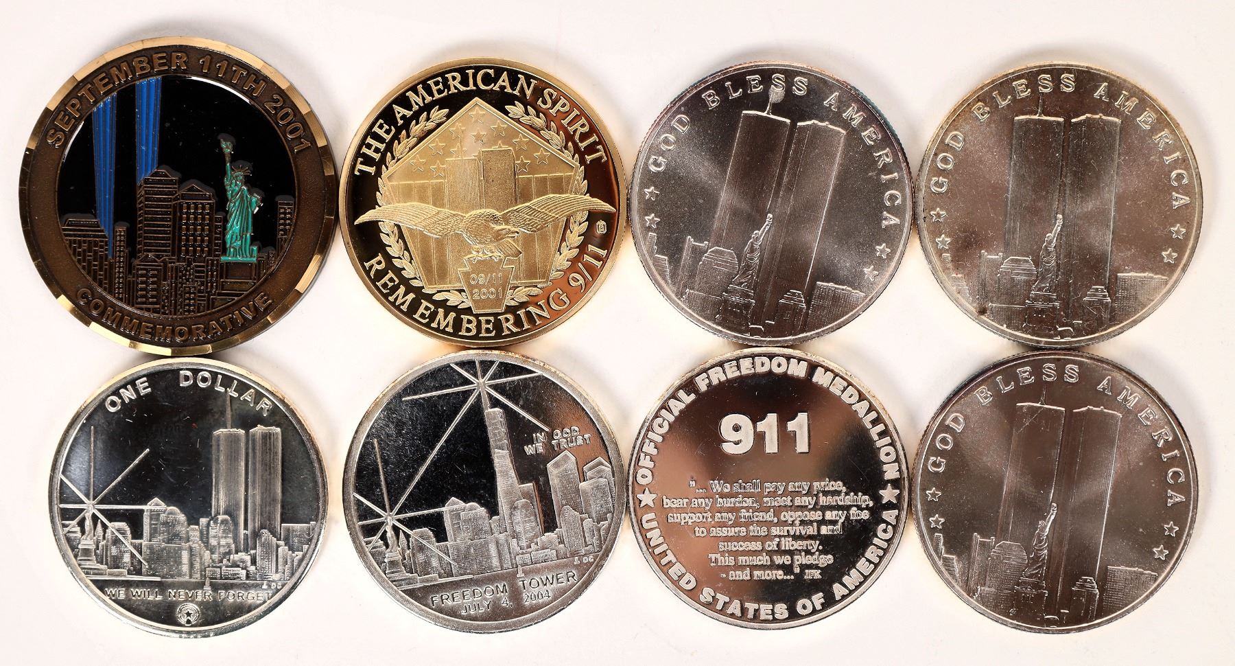 Lot of eight medals commemorating the 9/11 attacks and the Freedom Tower. Five silver, one colorful enameled bronze; The American Spirit in bronze.