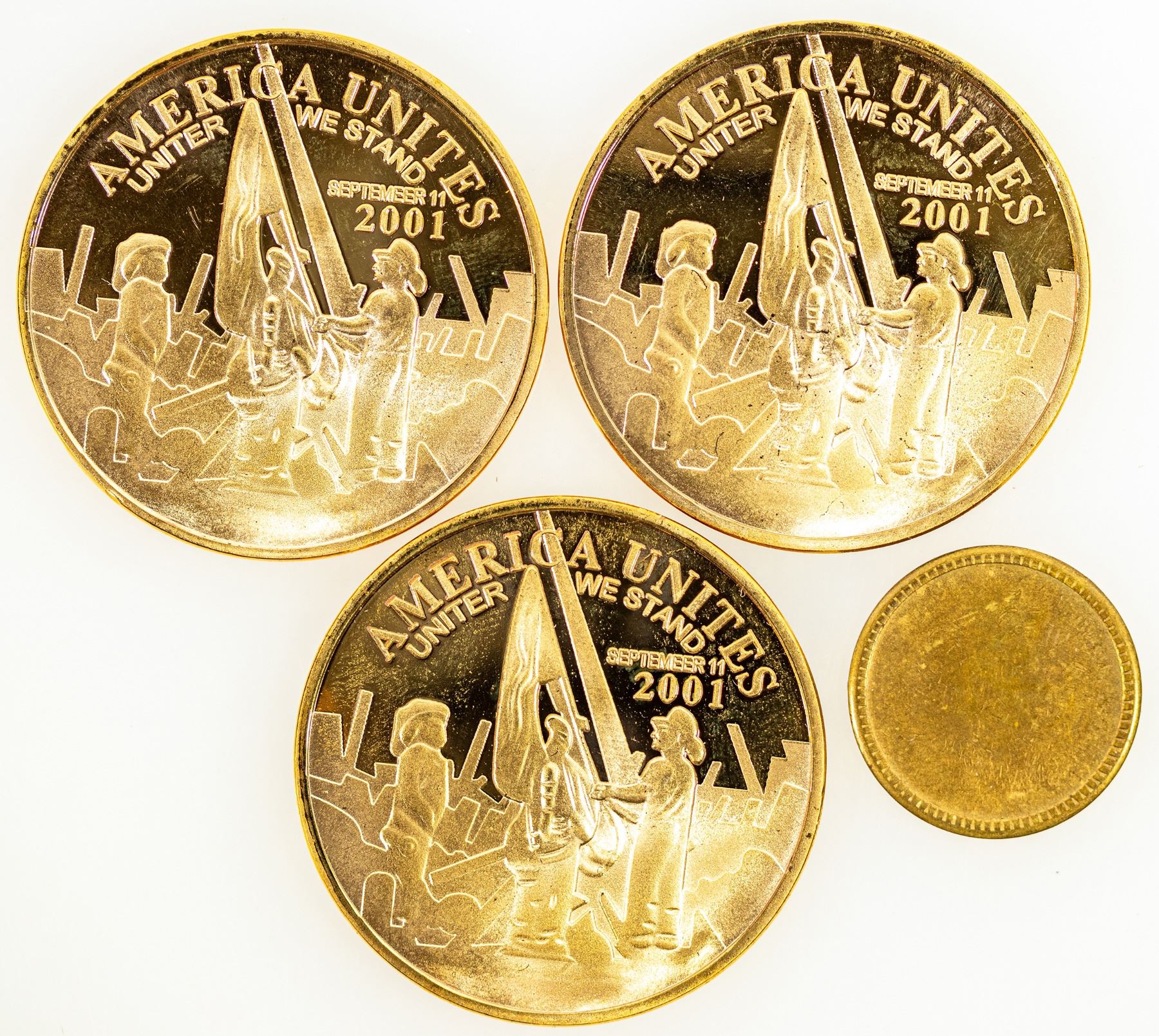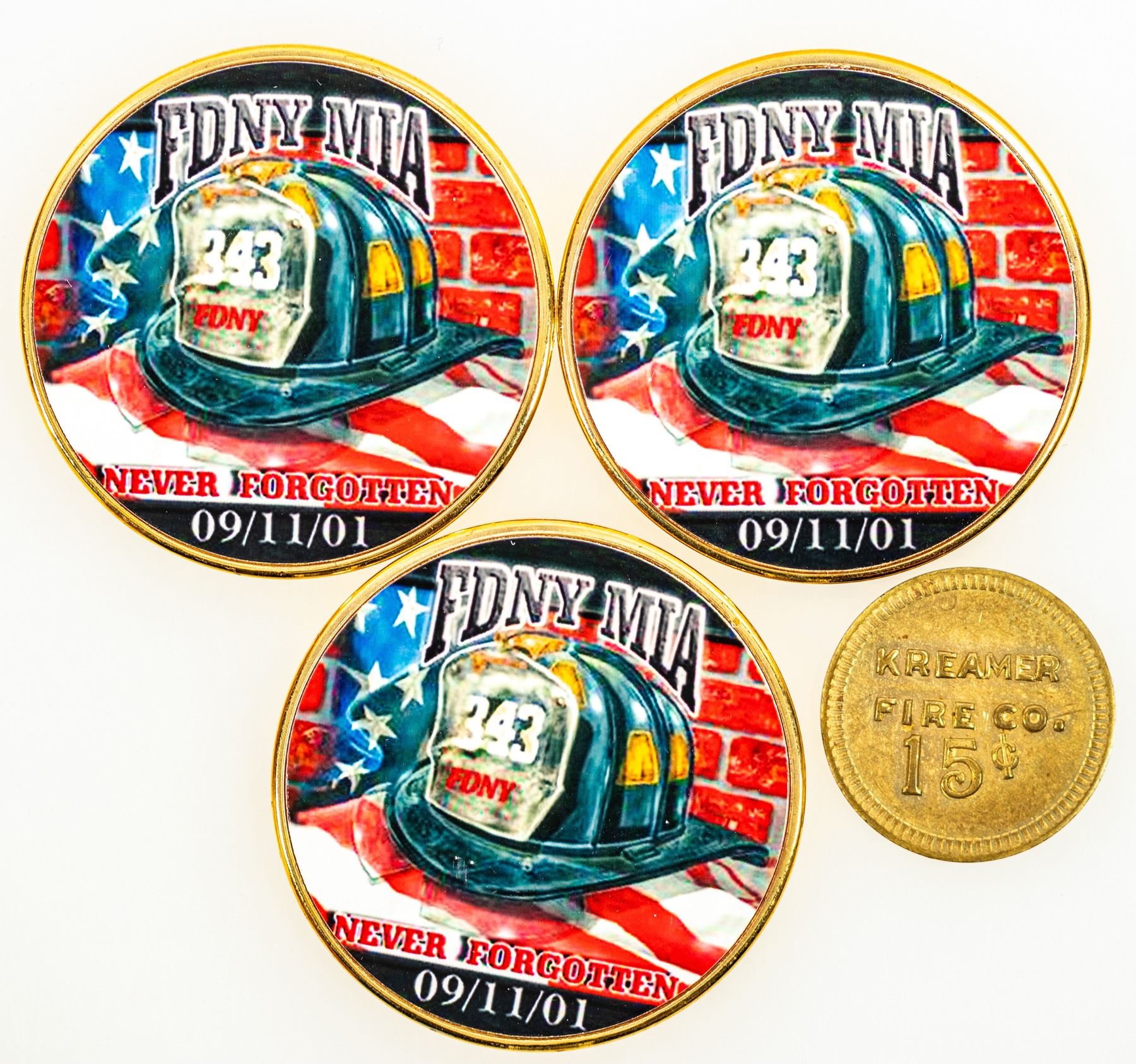 Lot of three medals commemorating the heroics of 9/11: Obv.: colorful enameling: FDNY MIA / Never Forgotten / 09/11/01; rev.: gold tone: America Unites / United We Stand / September 11, 2001. 40 mm. Also uniface Kreamer / Fire Co. / 15c; Br., rd., 22 mm. (Kreamer PA?)