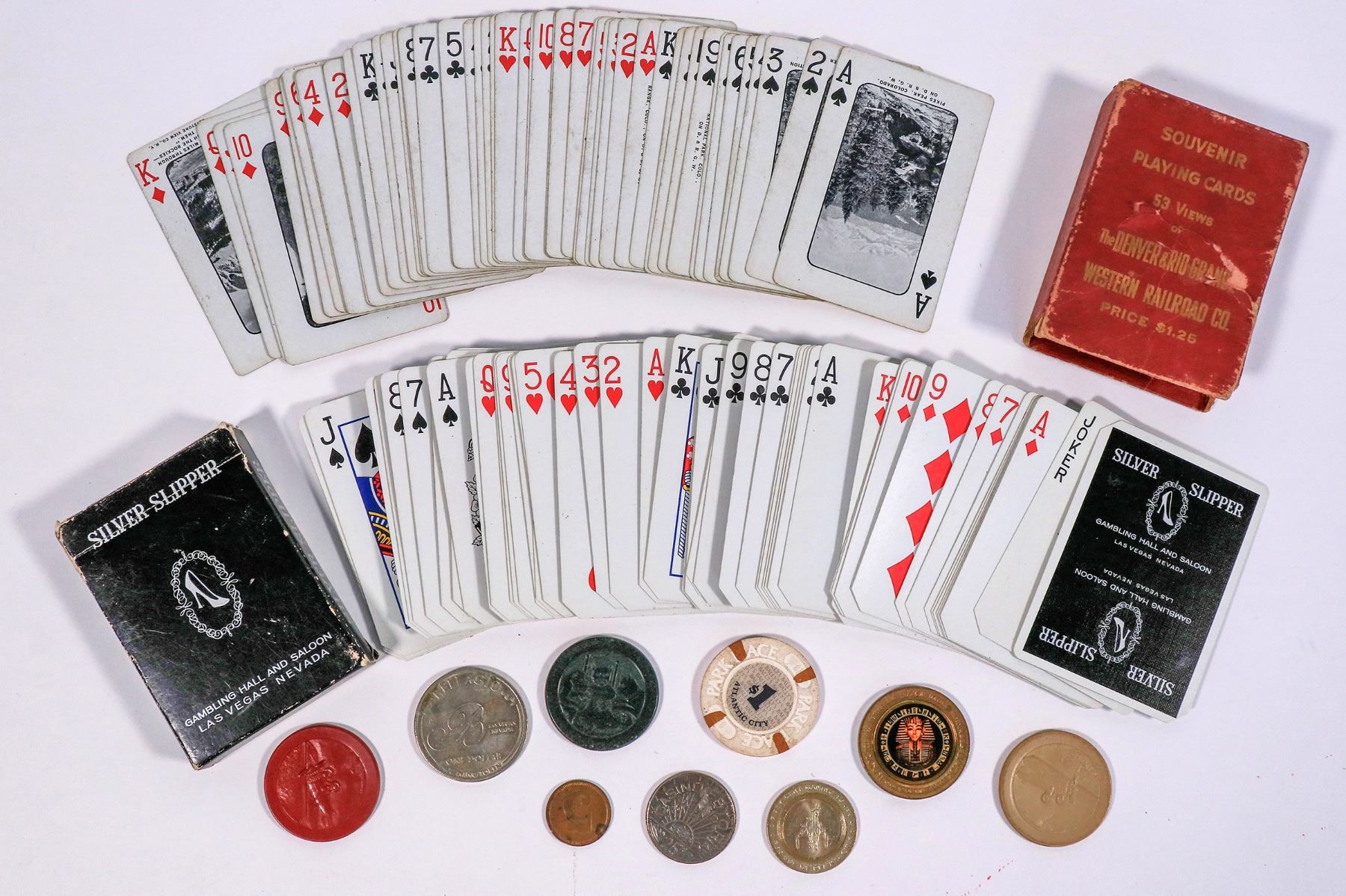 9 different 20th century gaming chips and tokens with metal and clay like material-Atlantic City, Las Vegas etc. Decks of cards in covers-Silver Slipper (c. 1950-88), Las Vegas and Denver & Rio Grande Railroad.