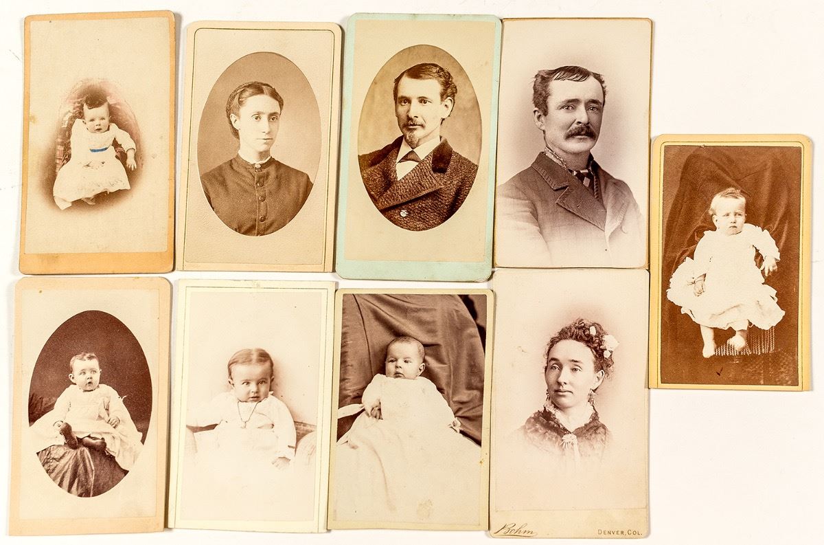 8 portrait CDVs from Denver, Colorado (listed): Kirkland Bros., 277 Larimer St.; W. G. Chamberlain, Larimer & 15th Streets; Chas. Bohm, 284 Fifteenth St.; Bates & Nye, Larimer and Fifteenth; Robinson, 372 Larimer; J. Collier, 415 Larimer St. 1 Nevada portrait CDV (unlisted) J. C. Kemp's Celebrated Flying Photograph Gallery, No. 27 North C Street, Virginia. City: Denver State: Colorado Date: ID# 32308